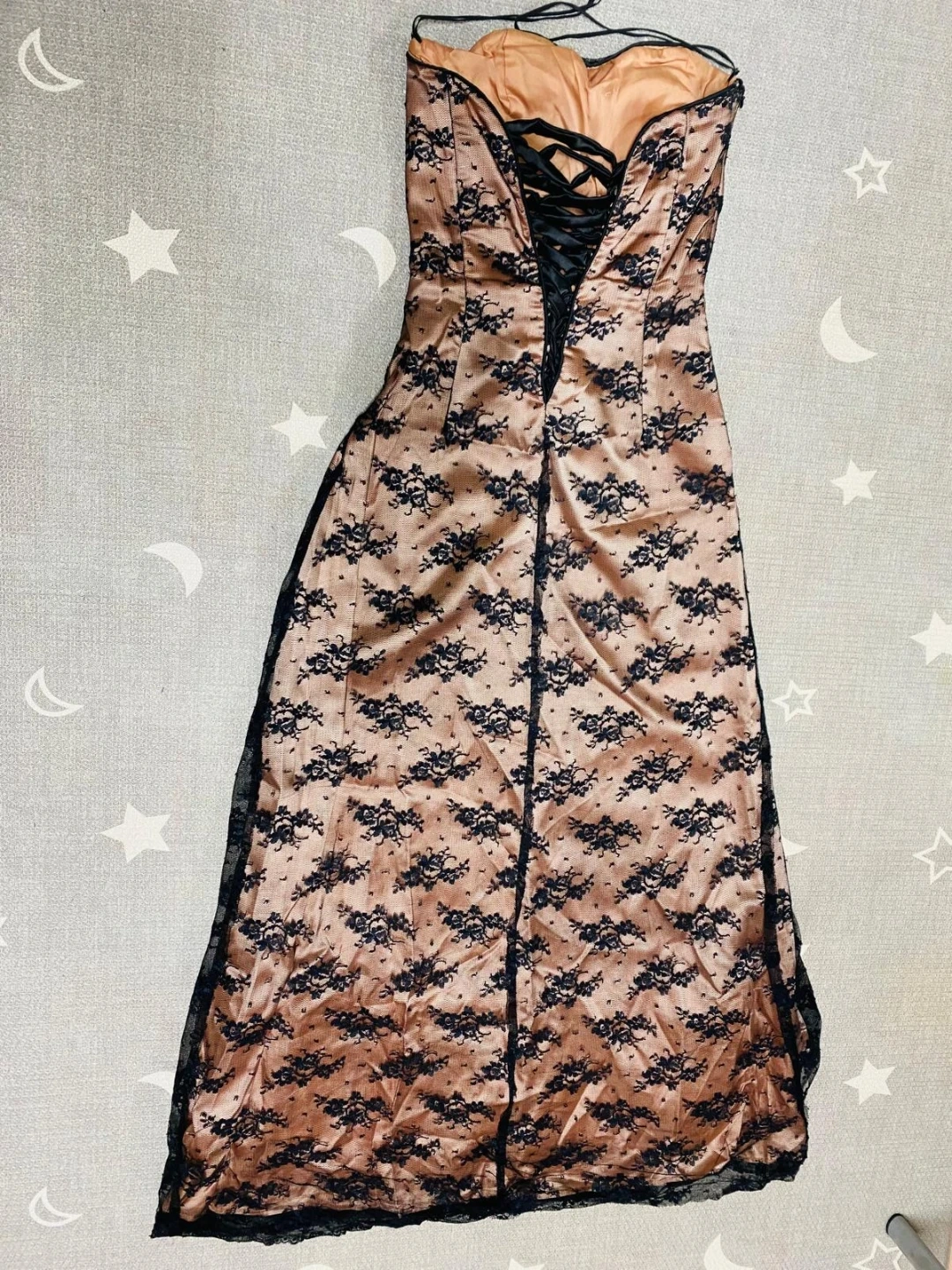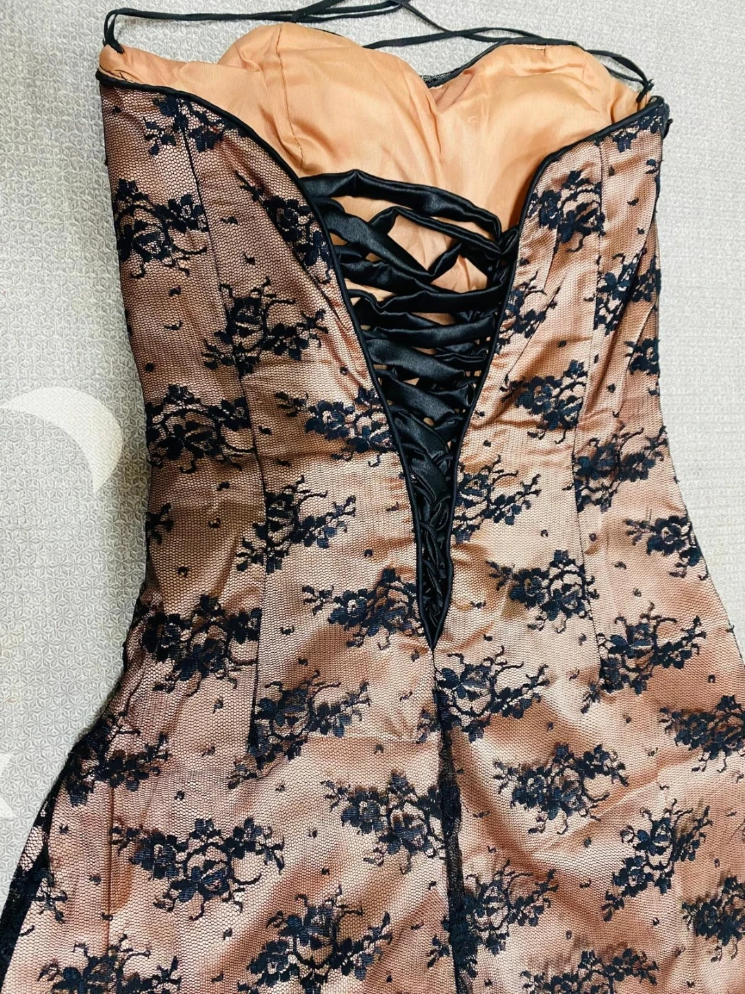 A beautiful strapless gown featuring a satin-like base with delicate black lace overlay. It has a lace-up corset back for an adjustable fit. This dress is perfect for special occasions.