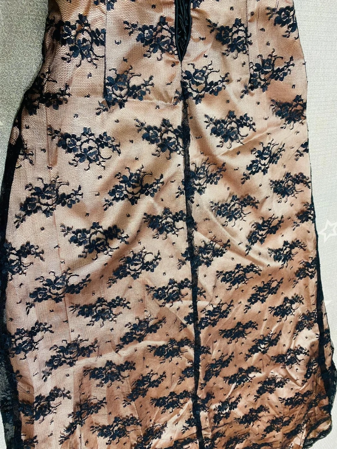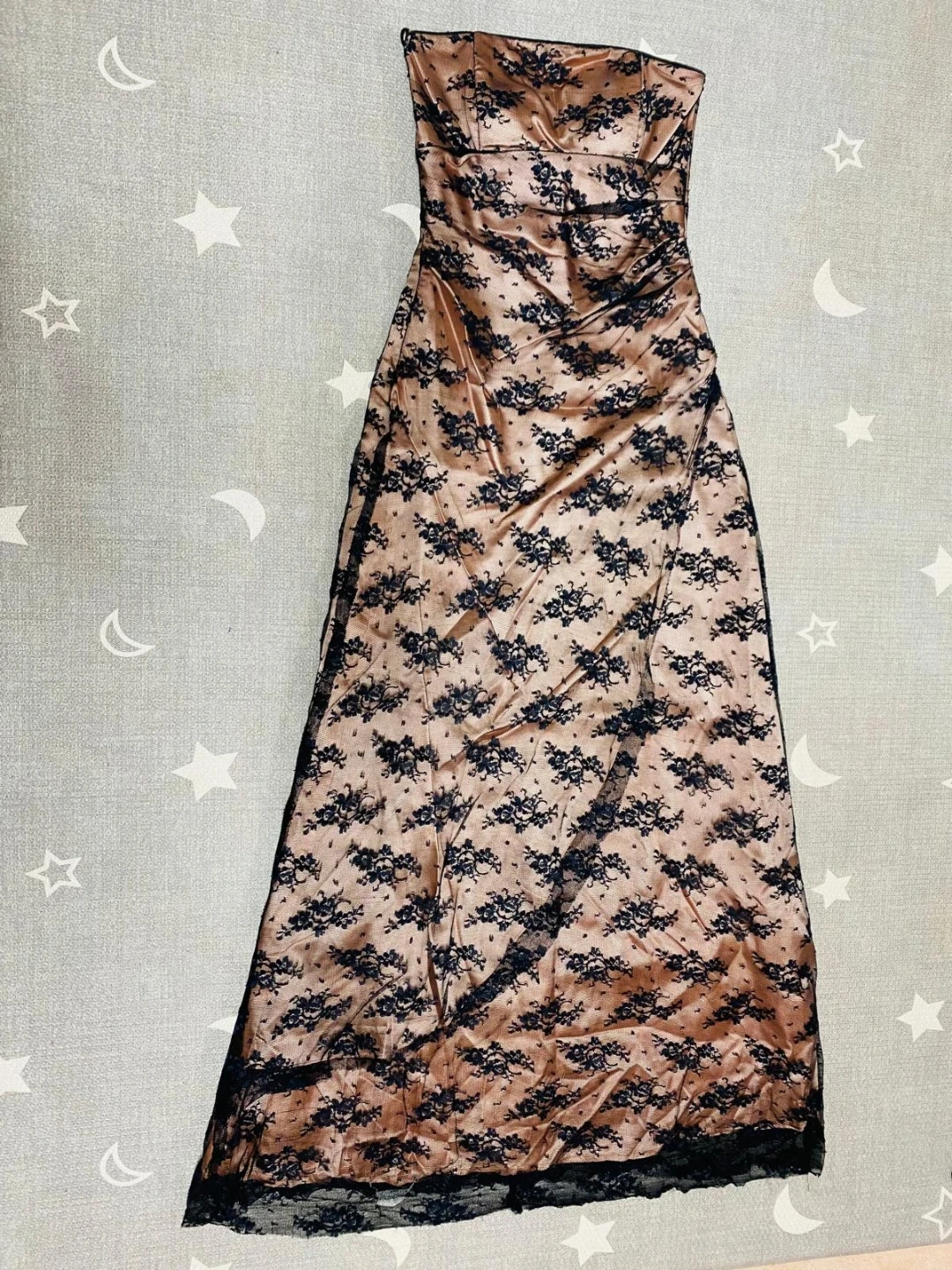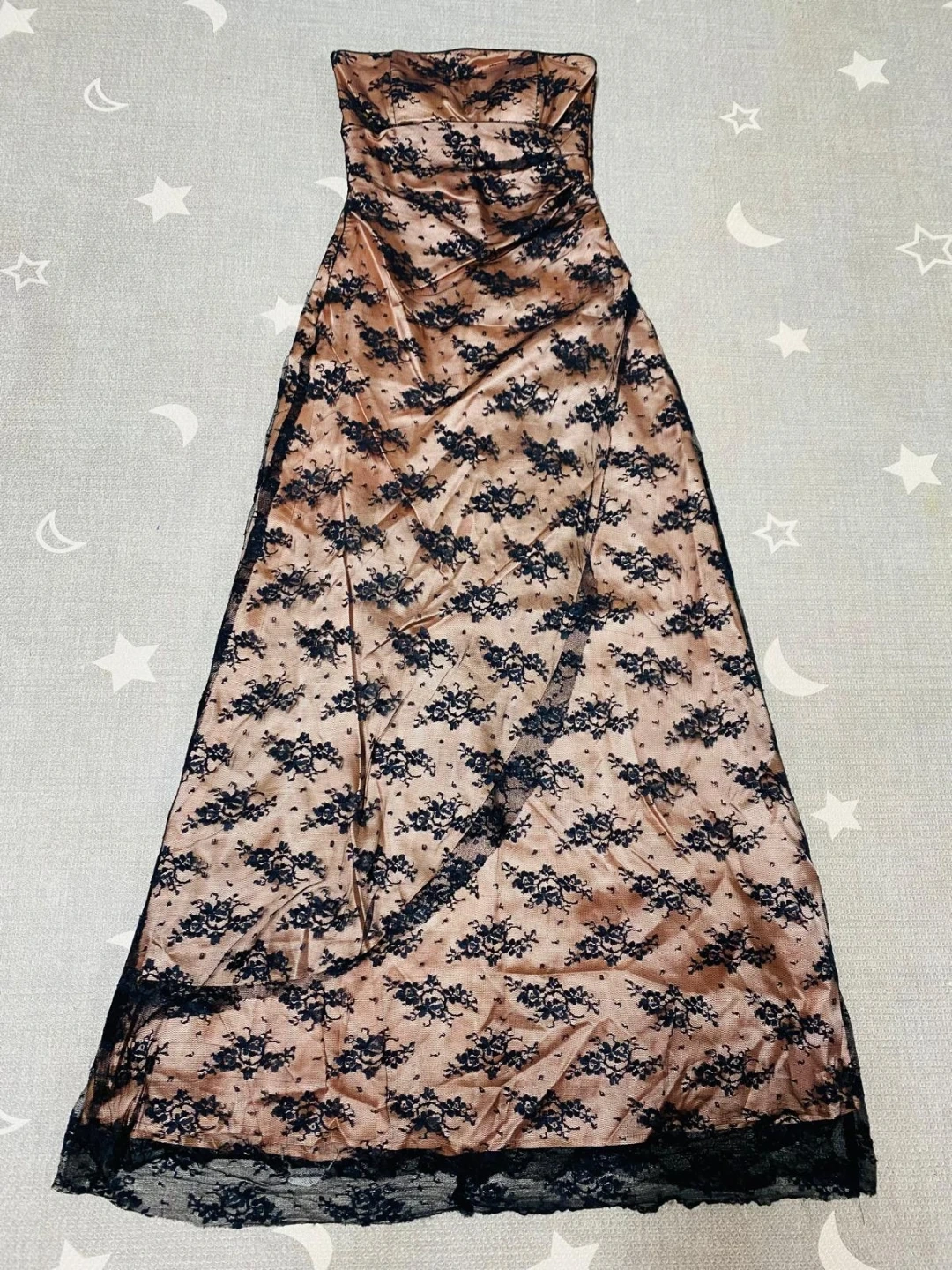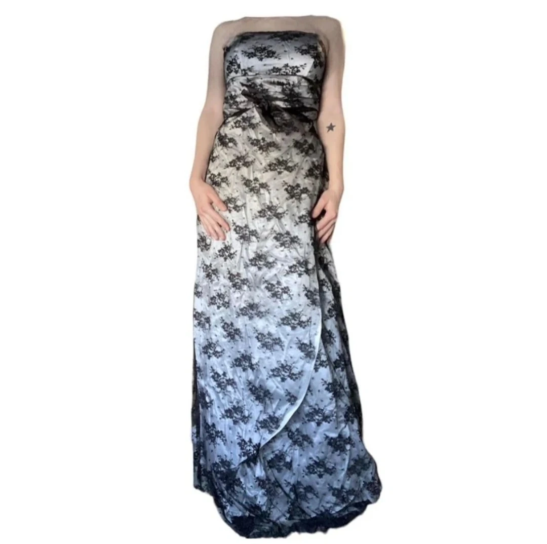 A beautiful strapless gown featuring a satin-like base with delicate black lace overlay. It has a lace-up corset back for an adjustable fit. This dress is perfect for special occasions.