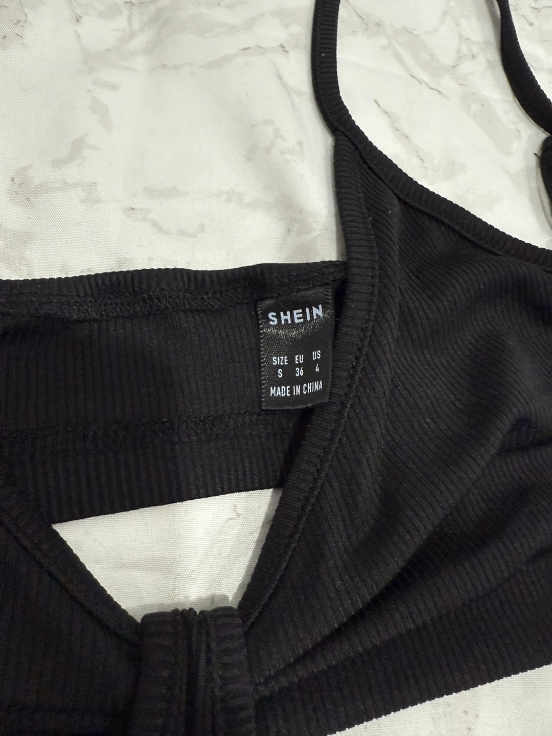 A cute black halter dress from Shein! It's a size small and in great condition. Perfect for a night out. Worn once and now this won’t fit