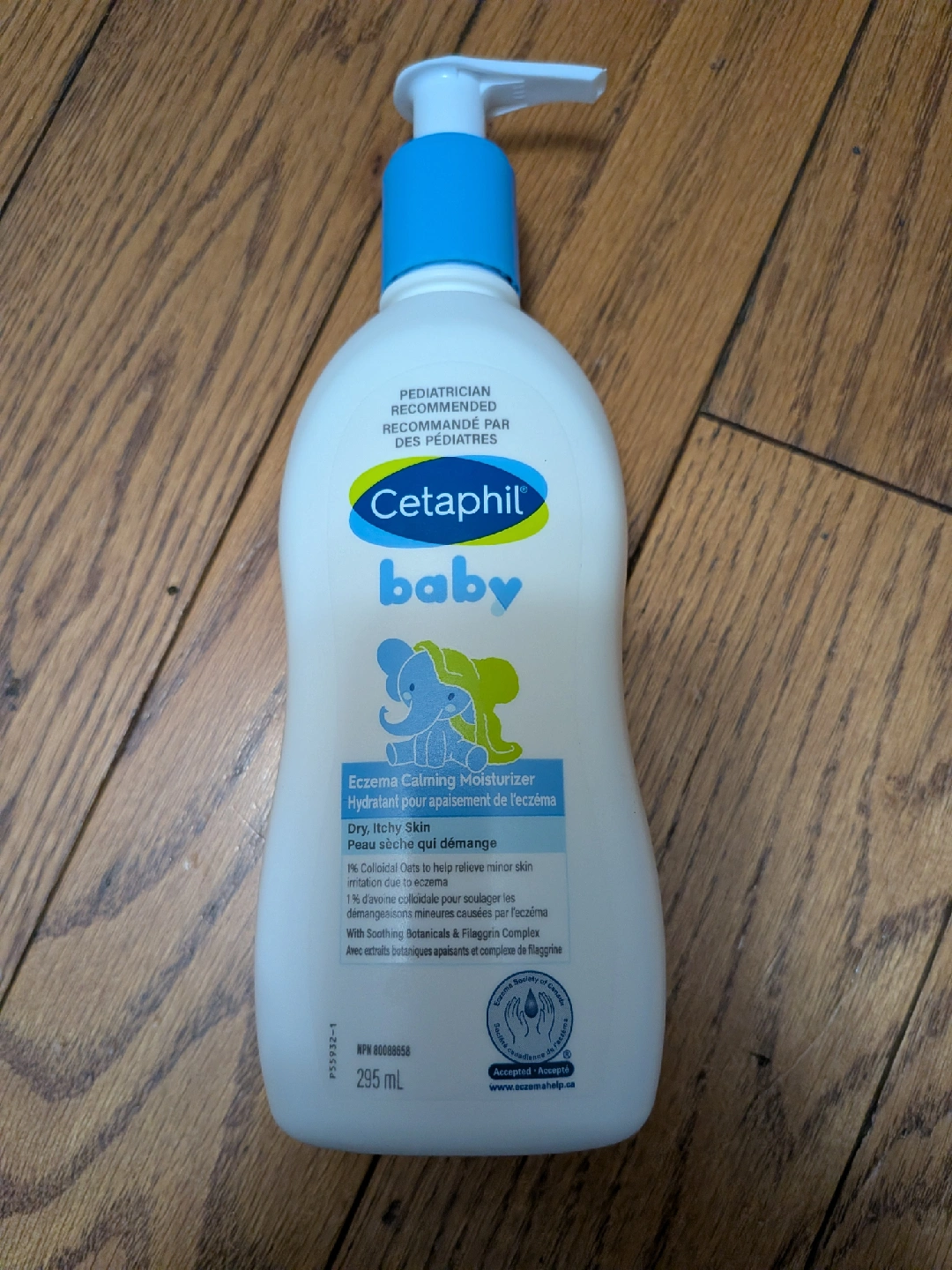 selling a bottle of Cetaphil Baby Eczema Calming Moisturizer. It's a hydrating lotion designed to soothe dry, itchy skin. Contains 295 mL of product and includes soothing botanicals