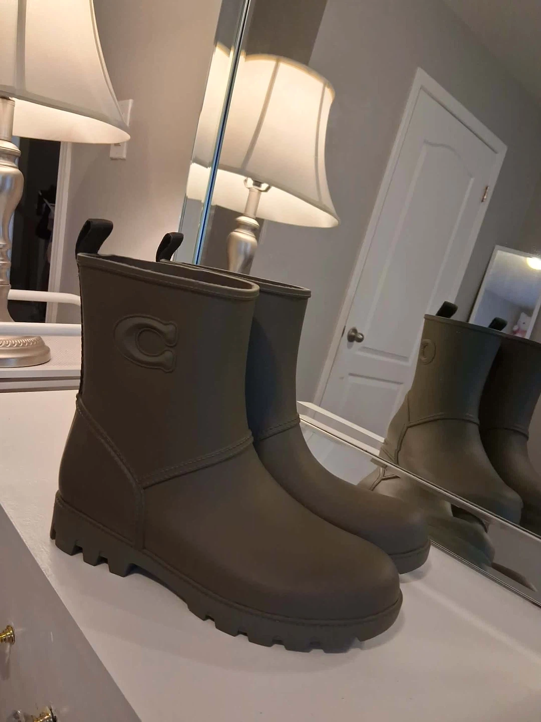 These Coach rubber boots are a size 8 and come in a army green colour. They're made from durable rubber with a lug sole for good traction. Pull tabs at the back make 'em easy to slip on.
