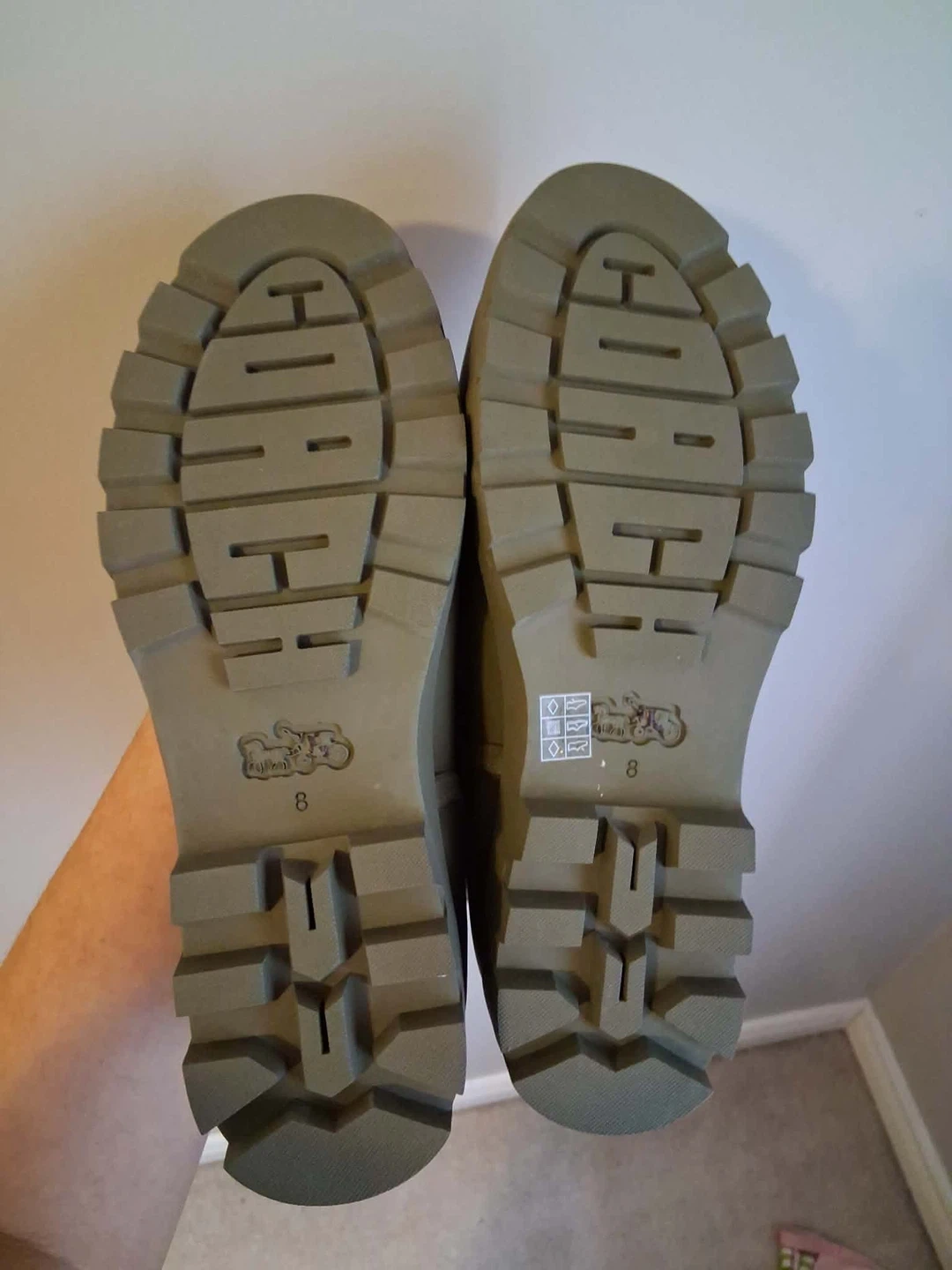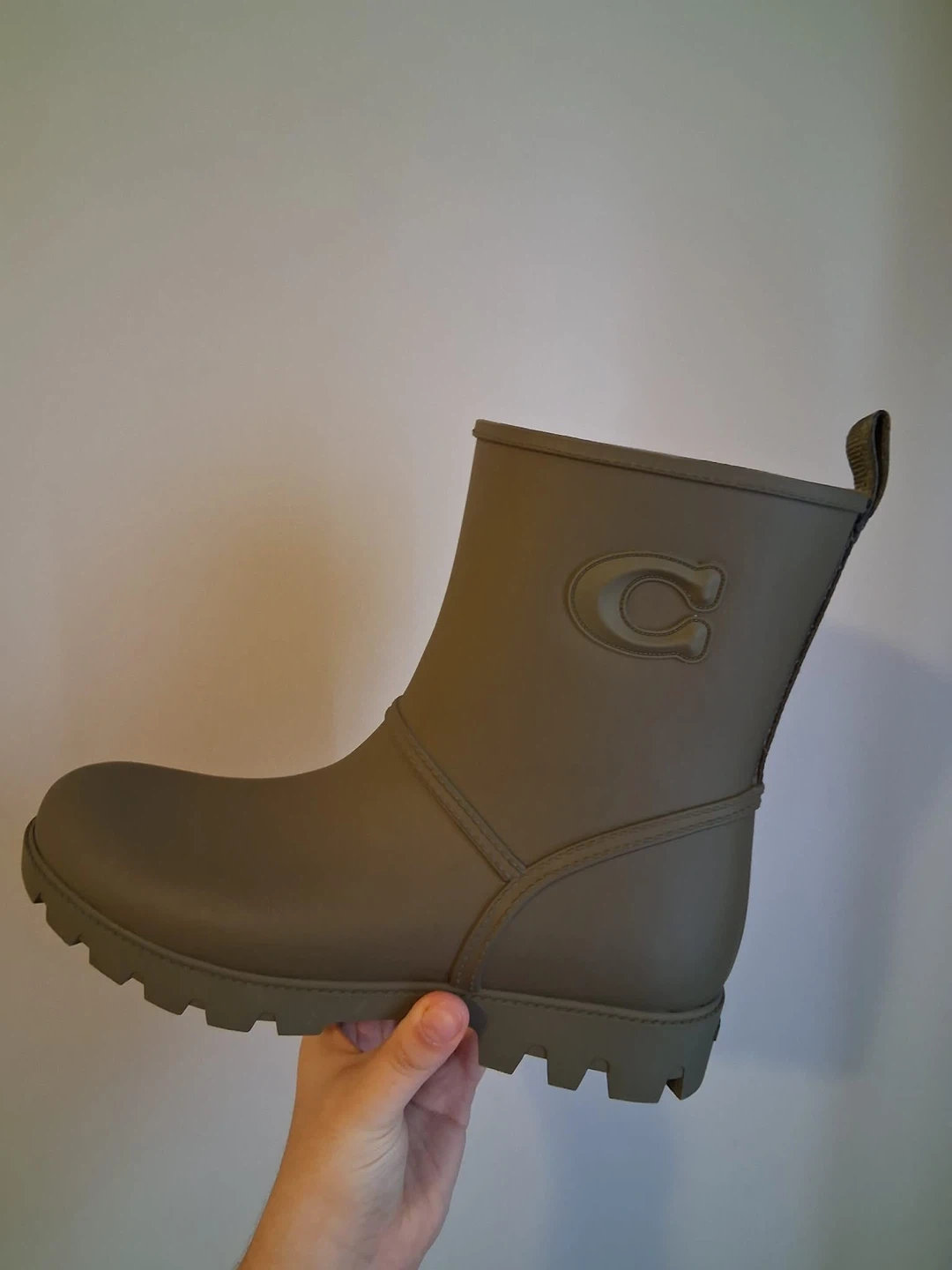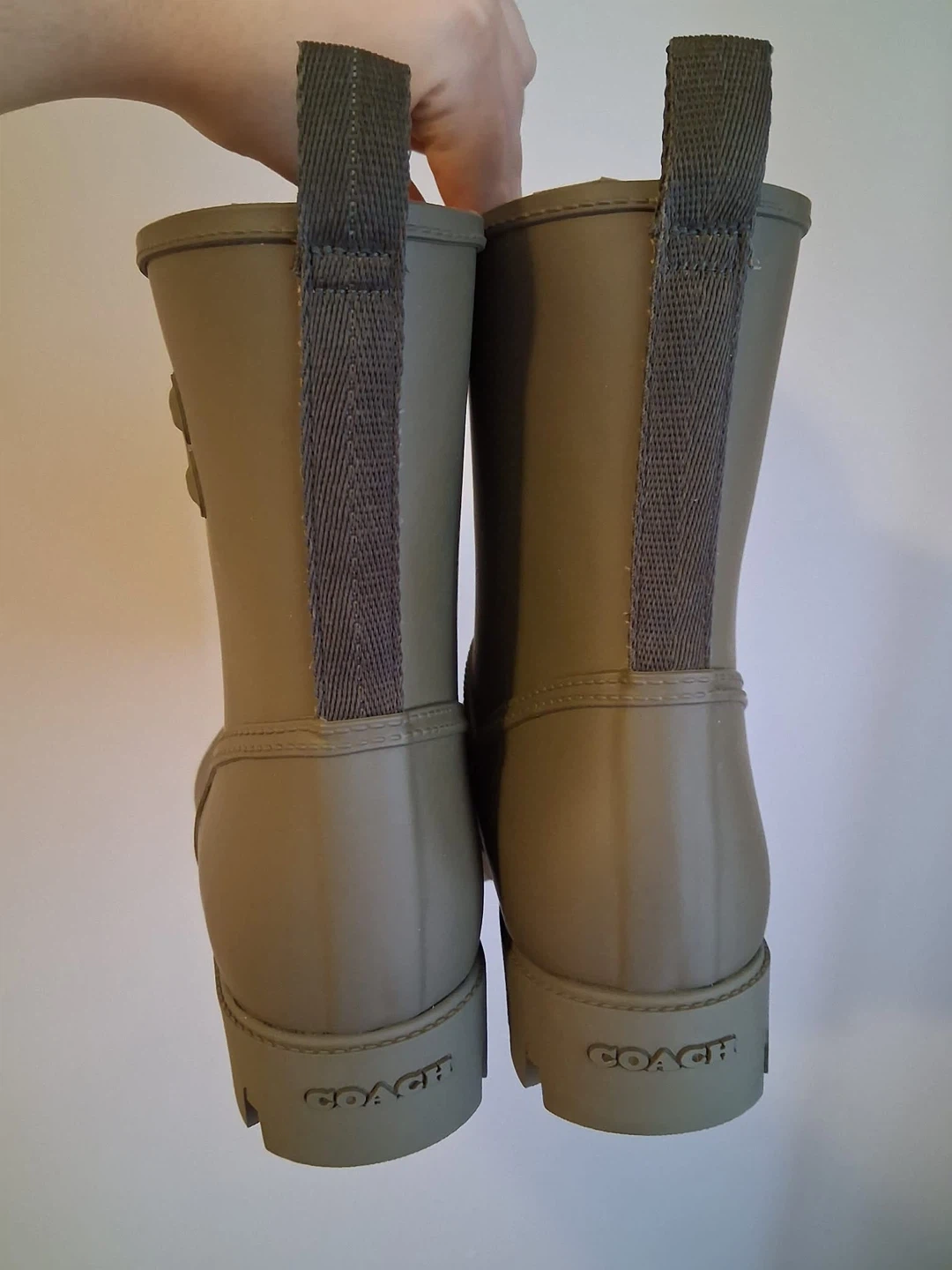 These Coach rubber boots are a size 8 and come in a army green colour. They're made from durable rubber with a lug sole for good traction. Pull tabs at the back make 'em easy to slip on.