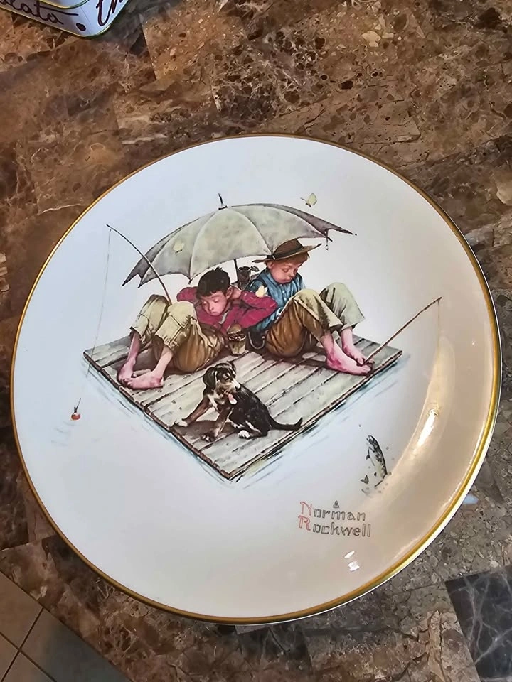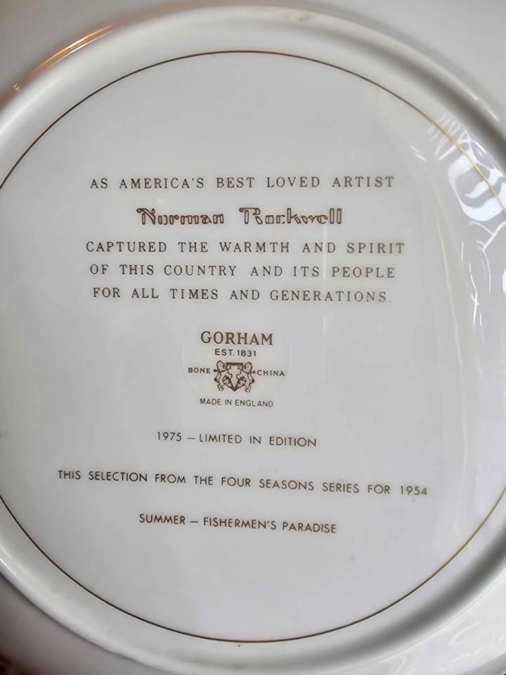 Selling a gold-rimmed Norman Rockwell collector plate titled 'Fishermen's Paradise'. It's from the Four Seasons series for 1954 and is a limited edition from 1975. The plate is made of bone china by Gorham in England, featuring a lovely image of boys fishing with a dog.