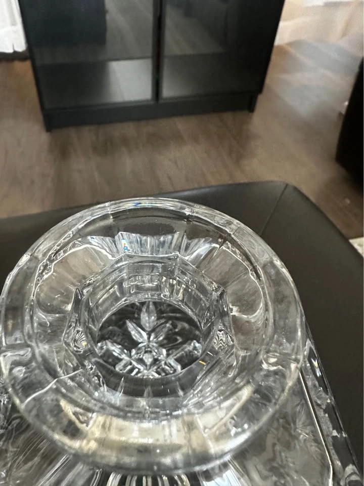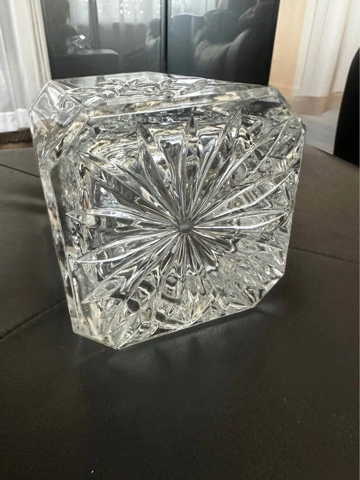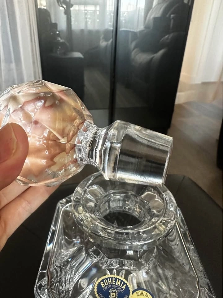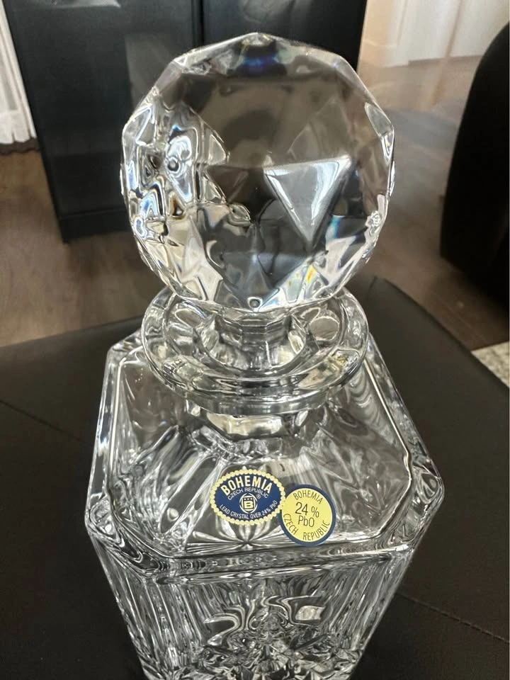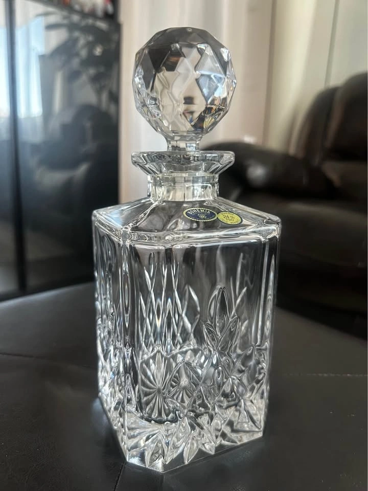 Elegant vintage crystal decanter from Bohemia Crystal, Oxford collection. Handmade in the Czech Republic from 24% lead crystal. This decanter features a classic square profile with an intricate geometric cut pattern and a faceted globe stopper — a timeless, high-end design. Details: Brand: Bohemia Crystal, Collection: Oxford, Origin: Czech Republic, Era: Vintage, Material: 24% lead crystal, Capacity: 800 ml, Design: Square body with deep geometric cuts, Stopper: Faceted crystal globe, Condition: Excellent vintage condition, no chips or cracks, Design status: Discontinued. Originally retailed for $150+, this vintage piece is no longer in production, making it a great find for collectors or a refined home bar. Perfect for whiskey, scotch, bourbon, or as a statement crystal display piece. Pickup preferred at New Westminster.
