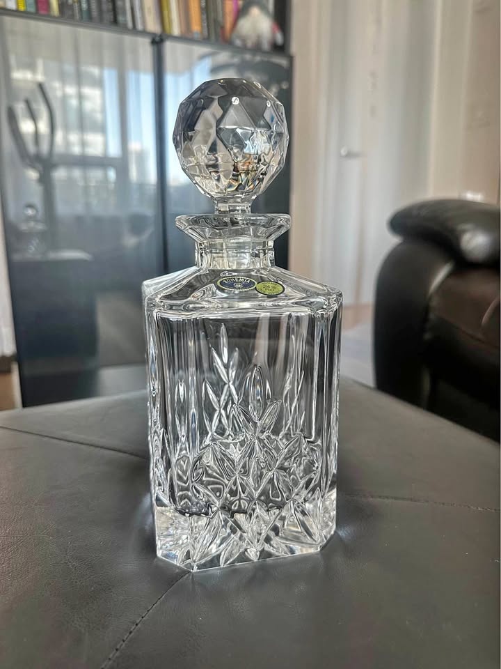Elegant vintage crystal decanter from Bohemia Crystal, Oxford collection. Handmade in the Czech Republic from 24% lead crystal. This decanter features a classic square profile with an intricate geometric cut pattern and a faceted globe stopper — a timeless, high-end design. Details: Brand: Bohemia Crystal, Collection: Oxford, Origin: Czech Republic, Era: Vintage, Material: 24% lead crystal, Capacity: 800 ml, Design: Square body with deep geometric cuts, Stopper: Faceted crystal globe, Condition: Excellent vintage condition, no chips or cracks, Design status: Discontinued. Originally retailed for $150+, this vintage piece is no longer in production, making it a great find for collectors or a refined home bar. Perfect for whiskey, scotch, bourbon, or as a statement crystal display piece. Pickup preferred at New Westminster.