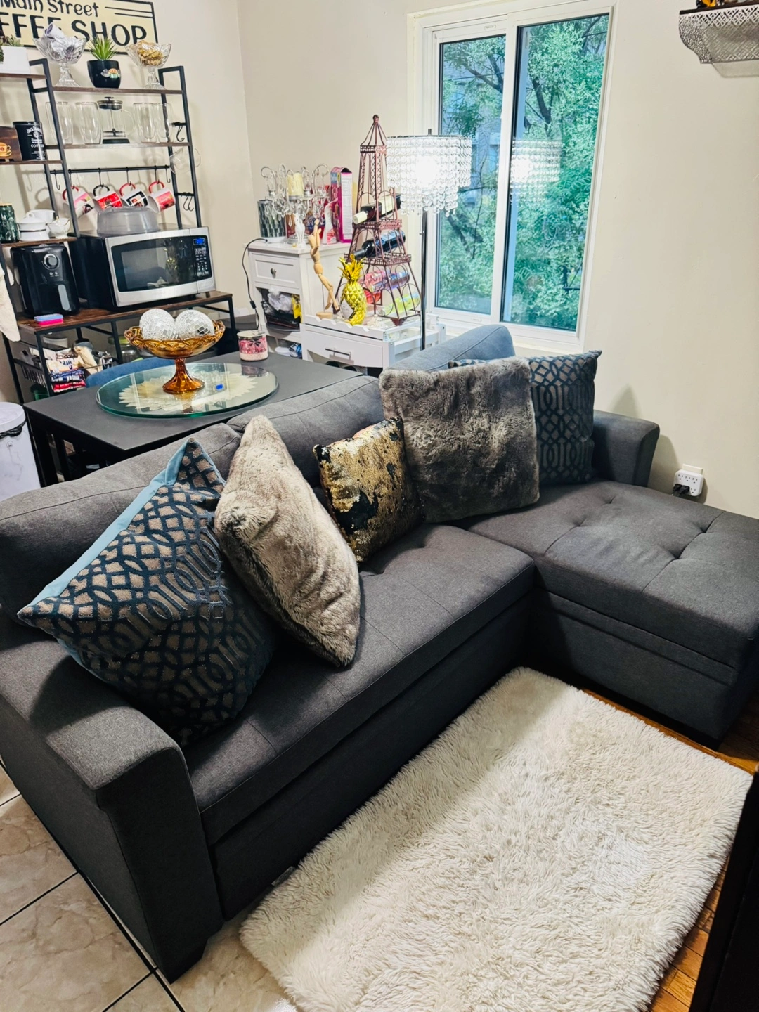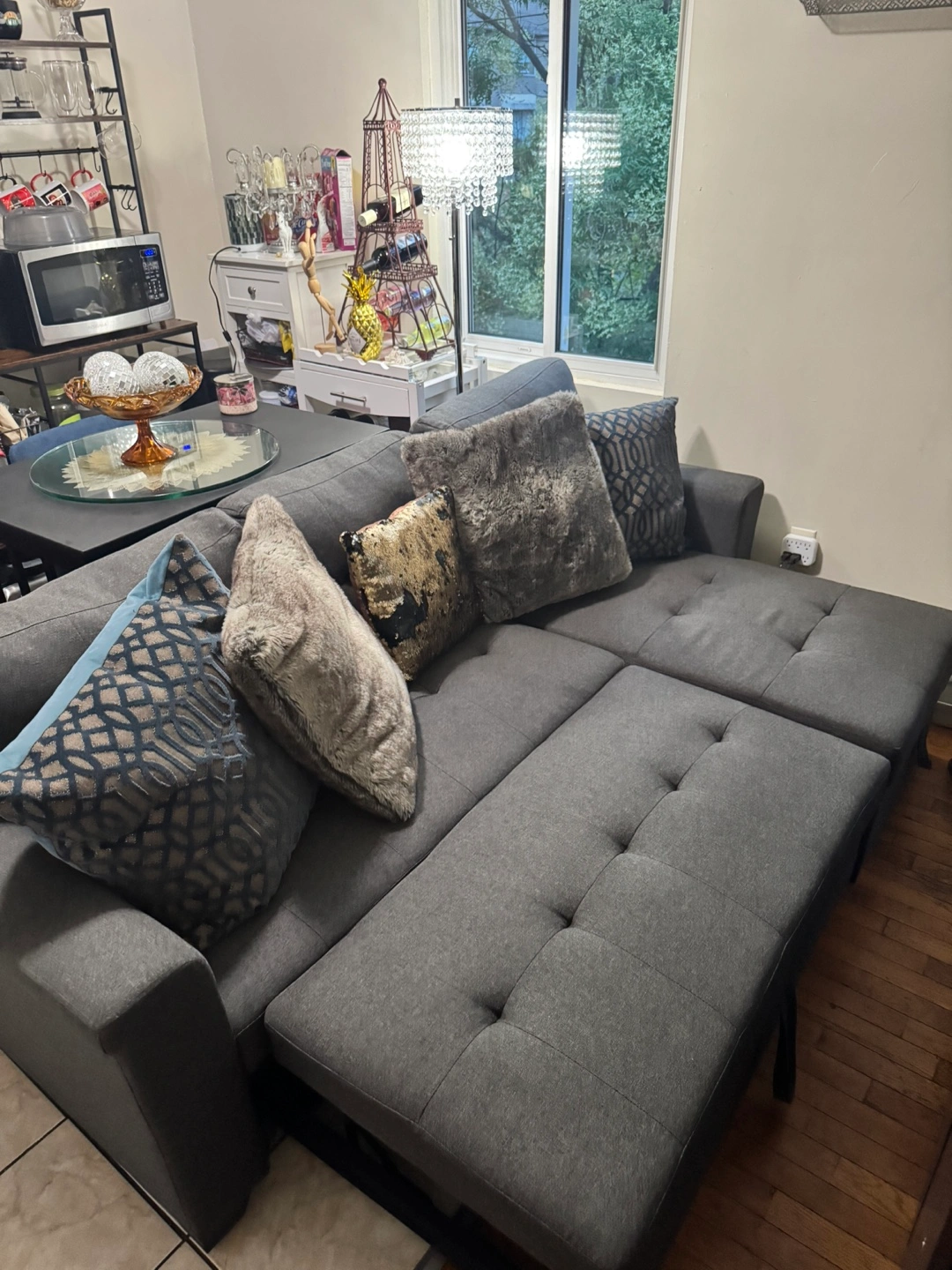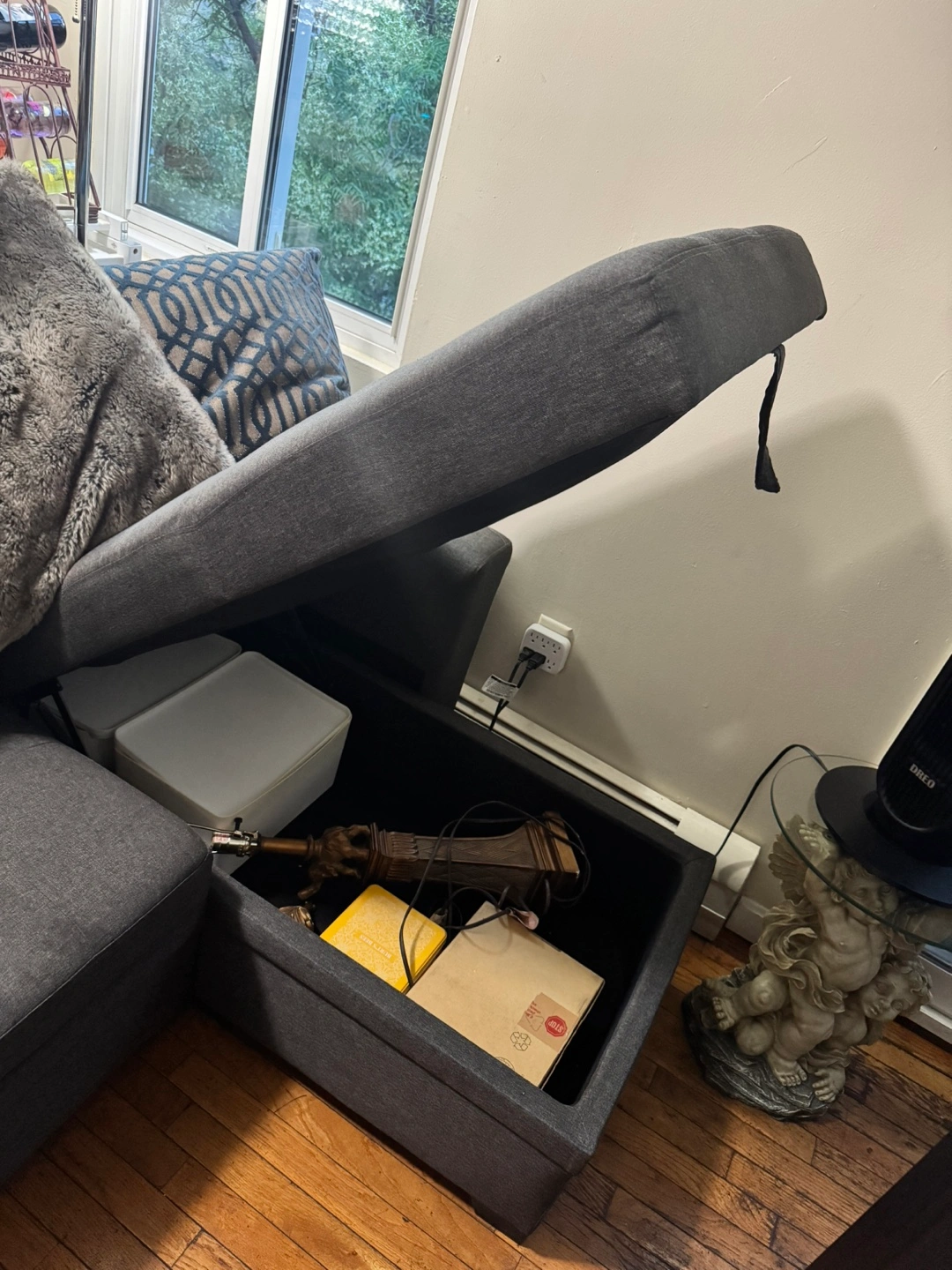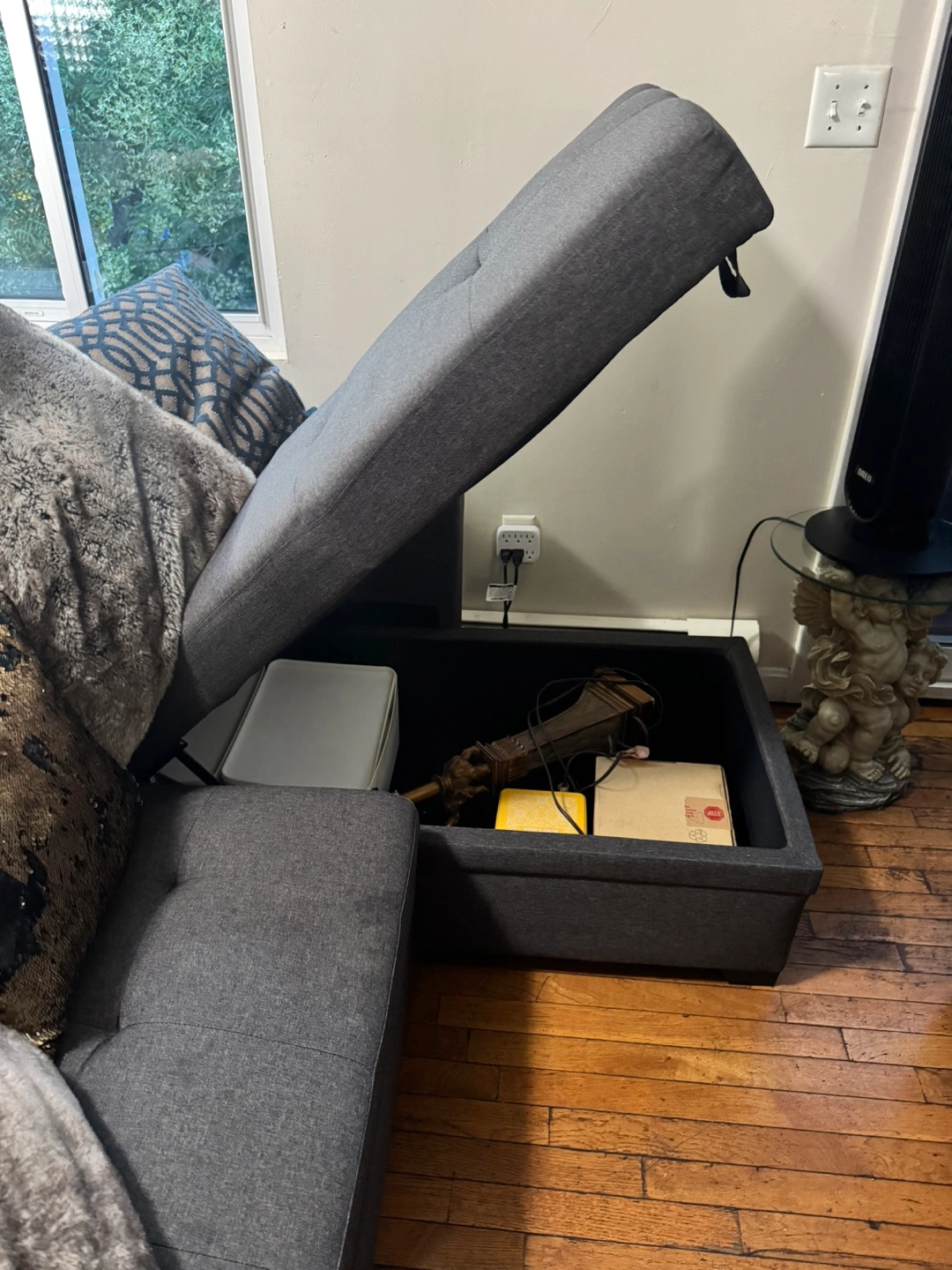 Selling a comfortable gray sectional sofa! It features a convenient storage compartment, perfect for blankets or other items. It's in good condition and ready for a new home! Easy to transport. Pet-free home. Ready for pickup from Jamaica Hills 11432.