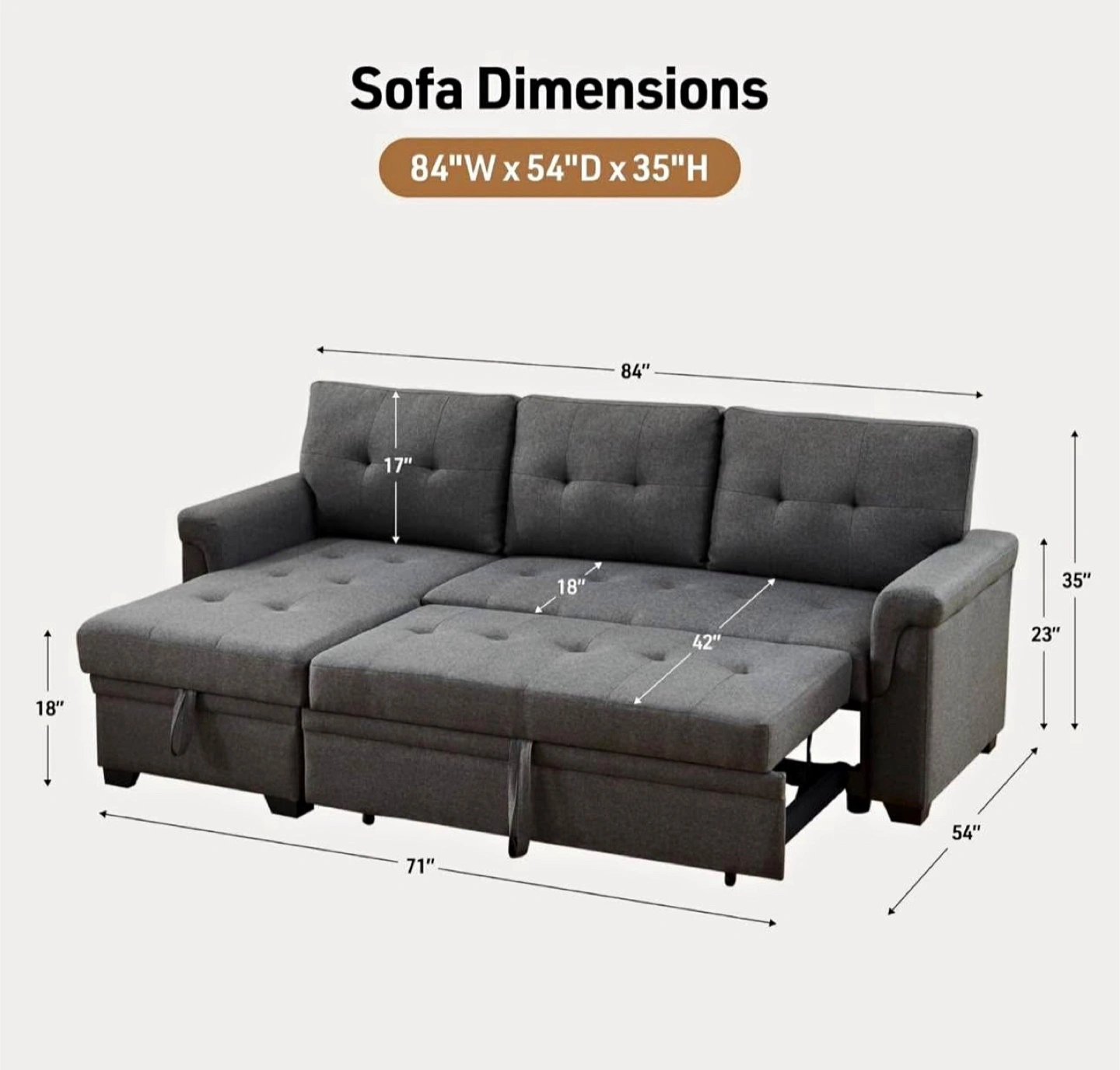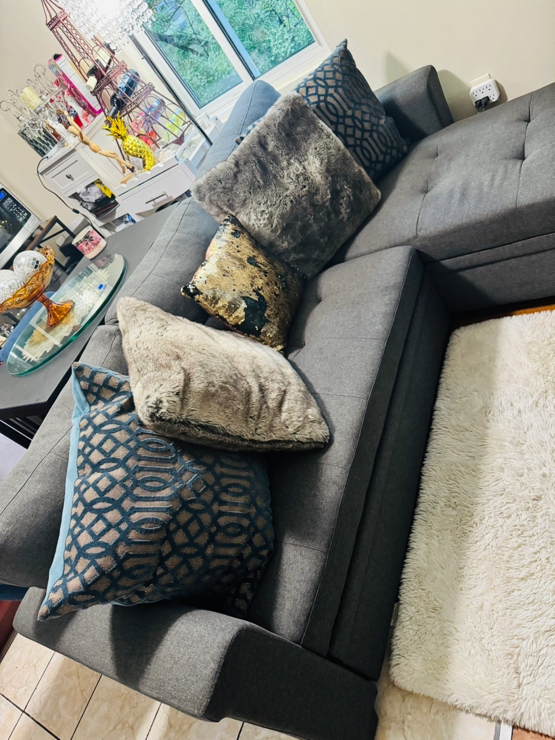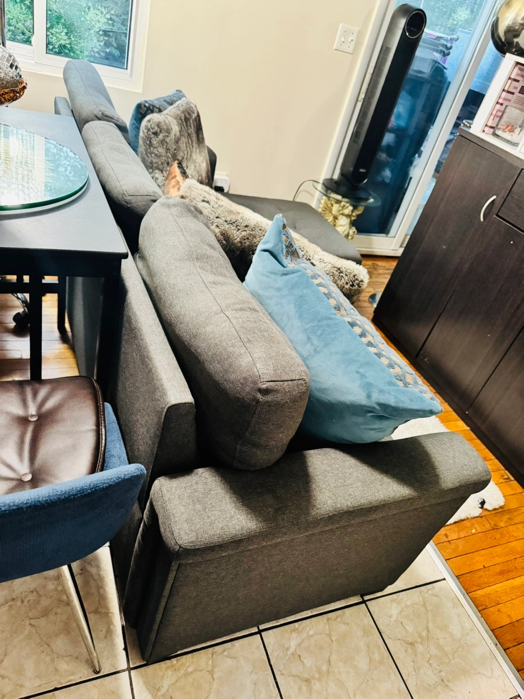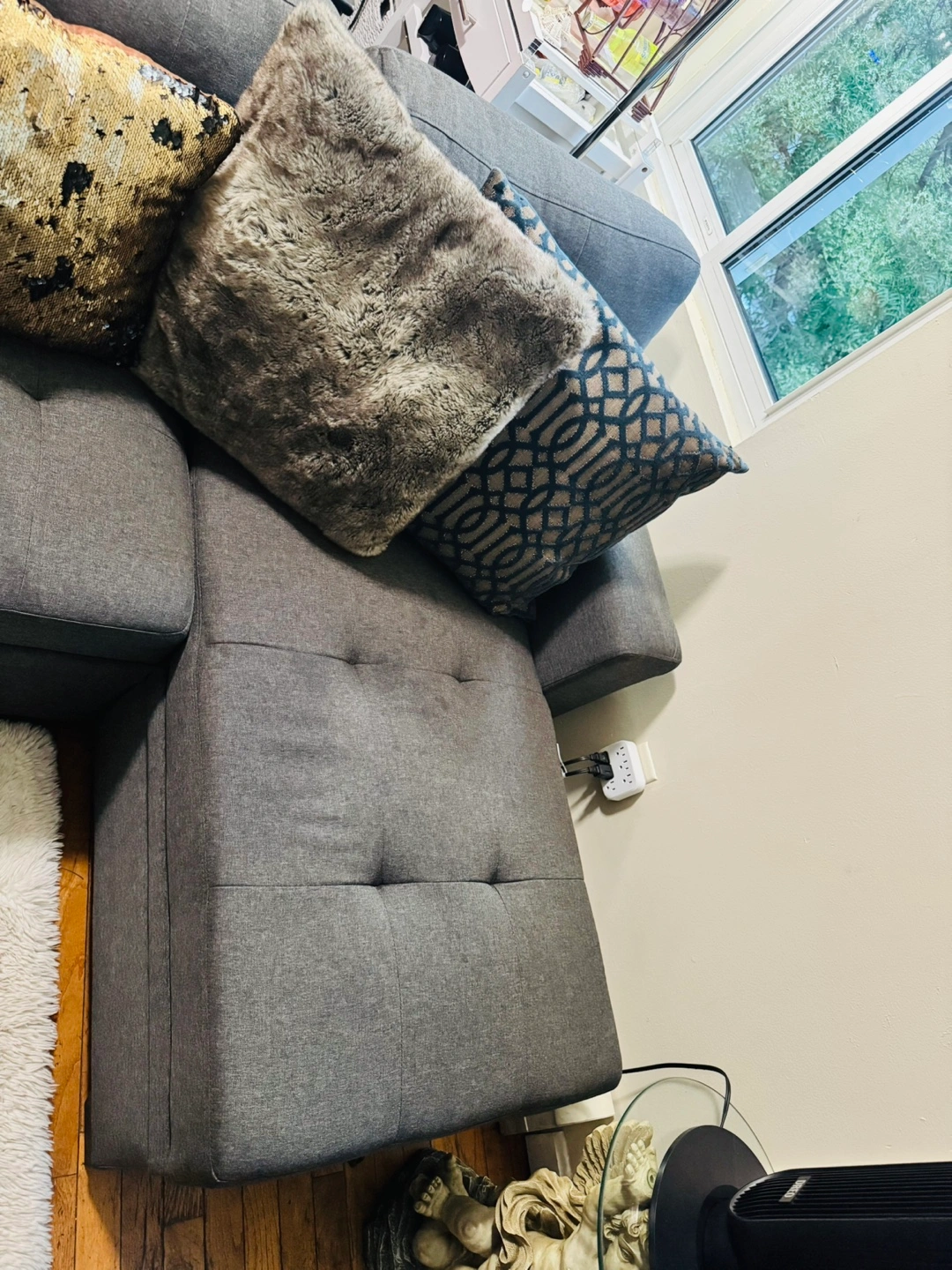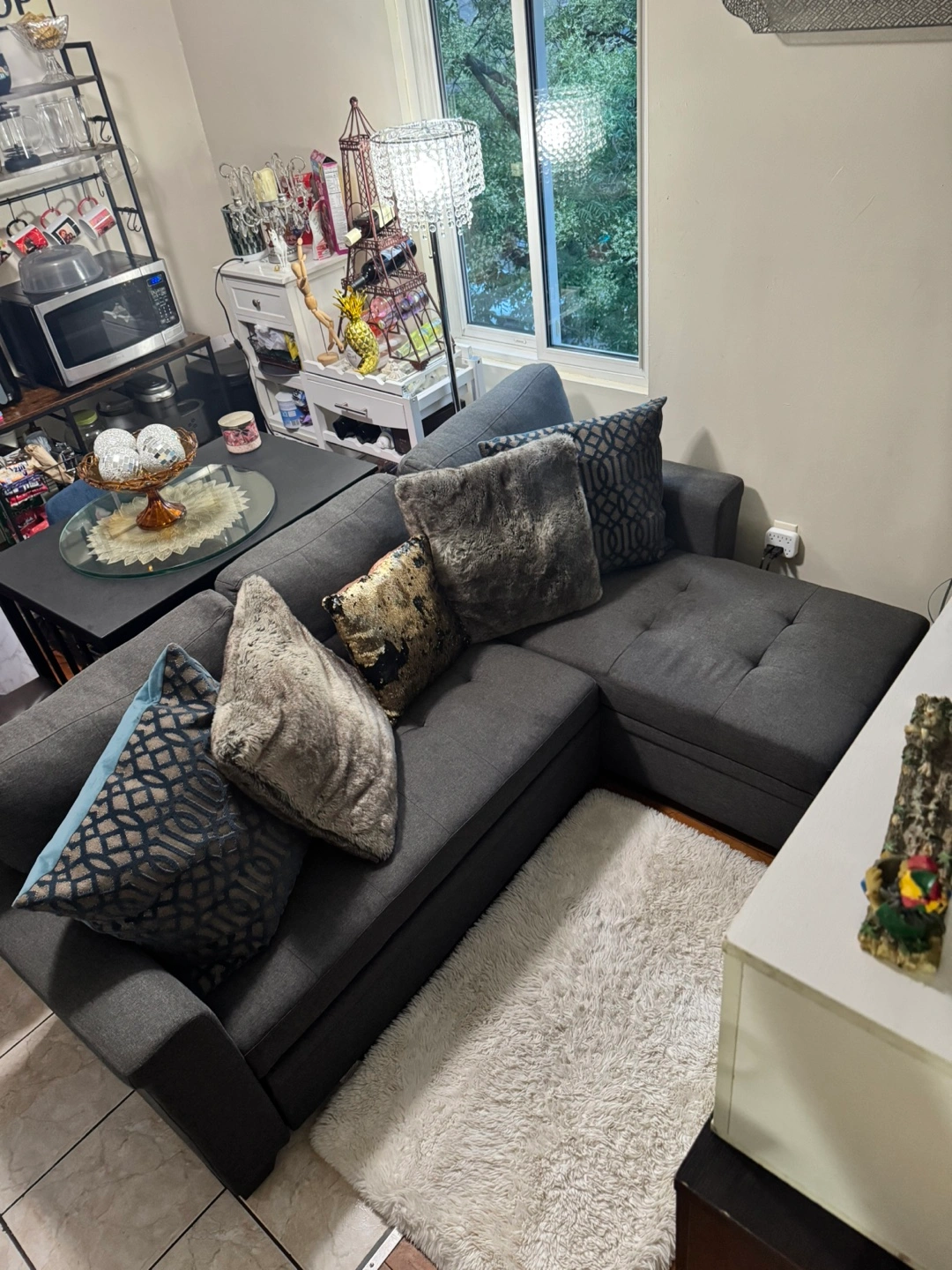 Selling a comfortable gray sectional sofa! It features a convenient storage compartment, perfect for blankets or other items. It's in good condition and ready for a new home! Easy to transport. Pet-free home. Ready for pickup from Jamaica Hills 11432.
