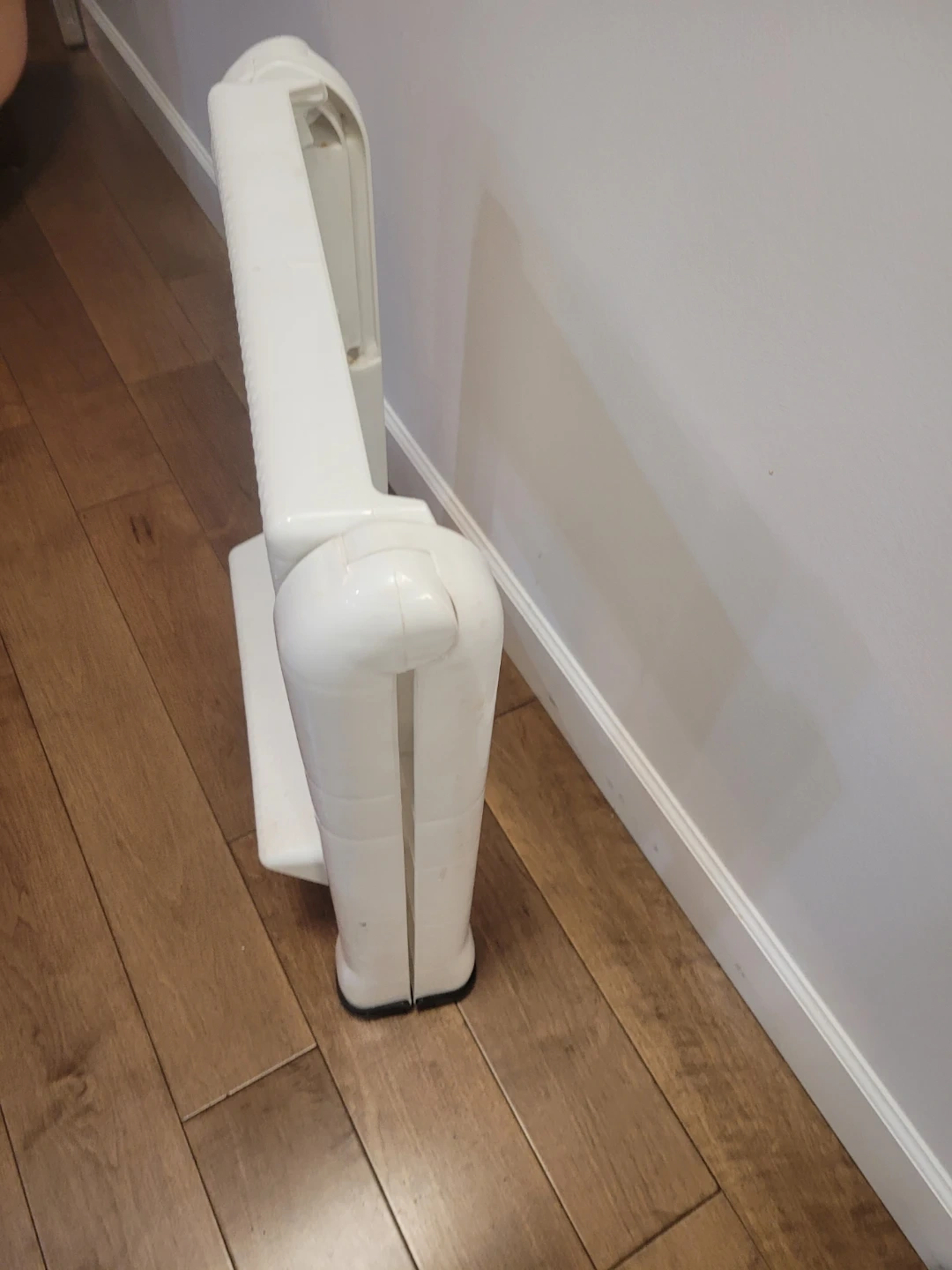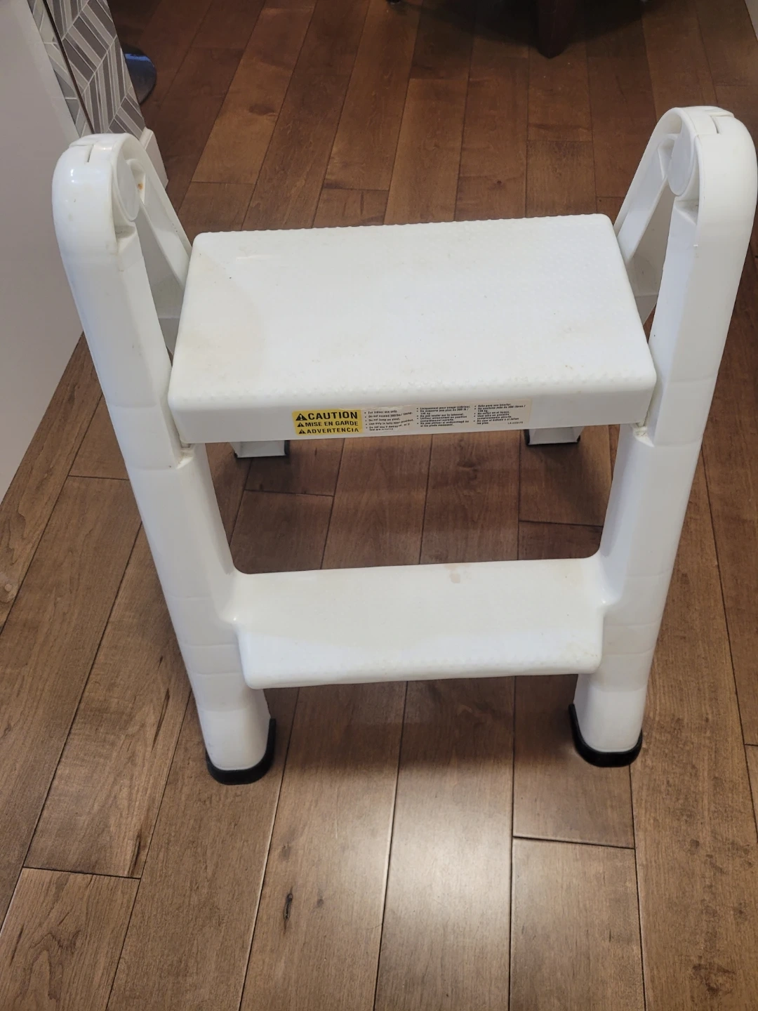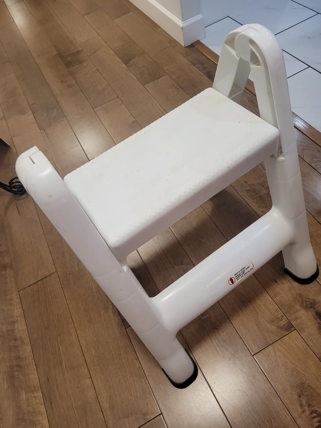 This is a white two-step folding step stool. It's made of durable plastic. It folds flat for easy storage. This stool is handy for reaching high shelves or cabinets!