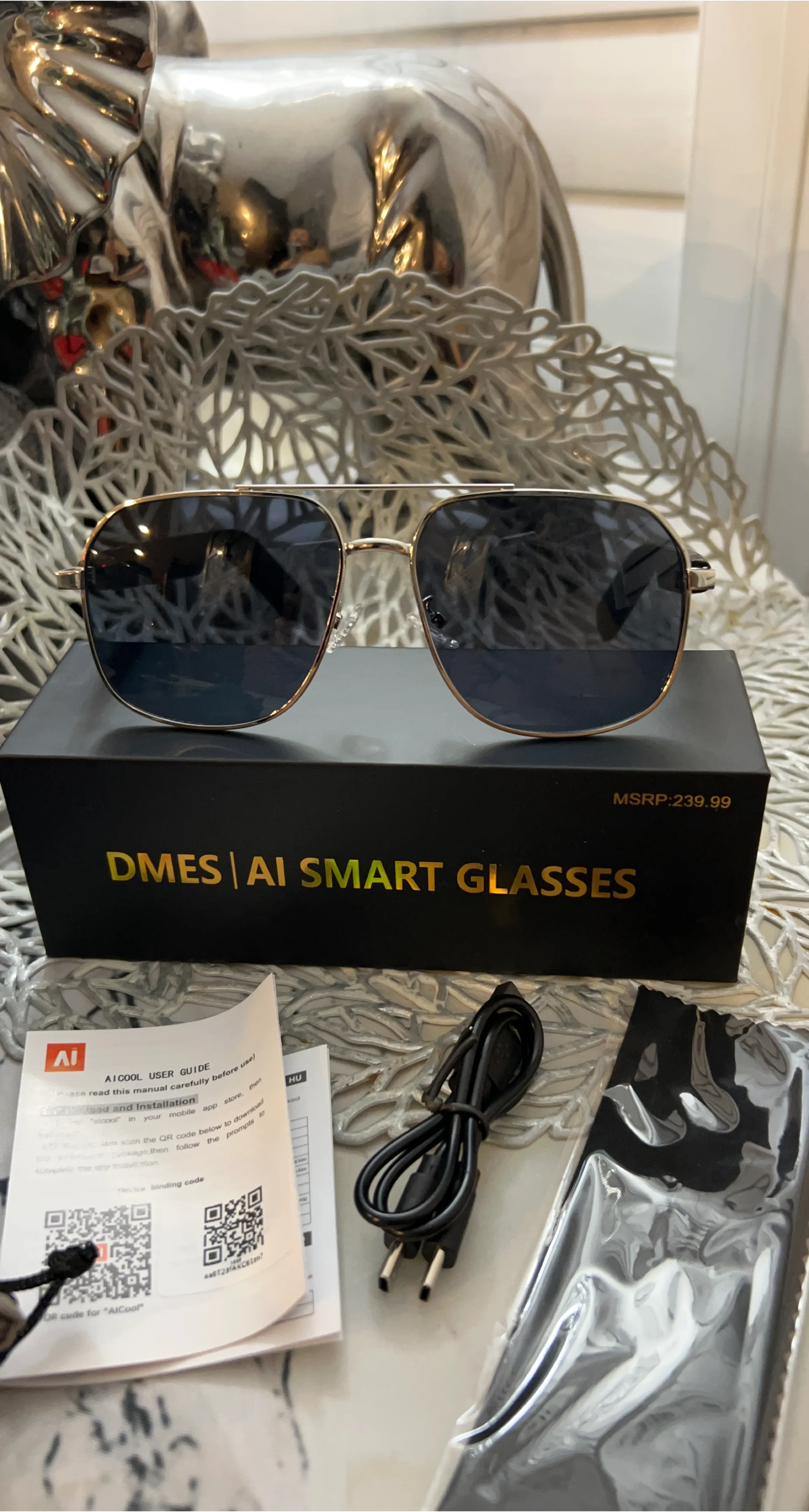These DMES AI Smart Glasses come in a gold frame with dark lenses. They include the user guide, charging cable, and a protective pouch. The MSRP was $239.99.