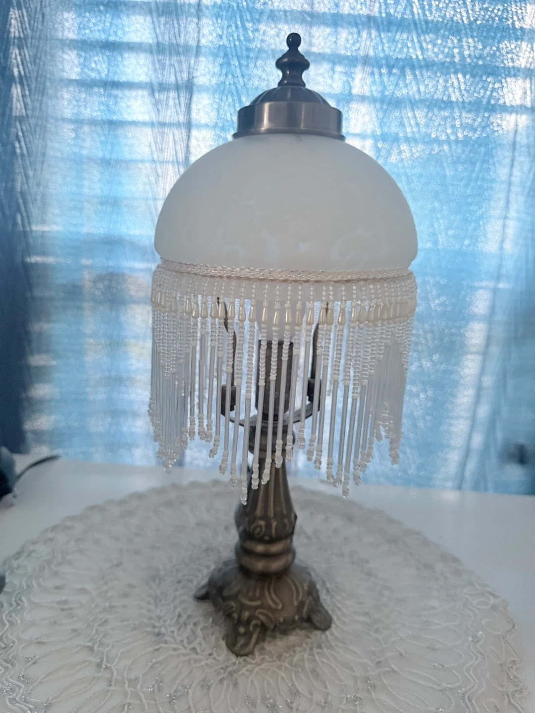 Vintage Frosted Glass Table Lamp with Beaded Fringe