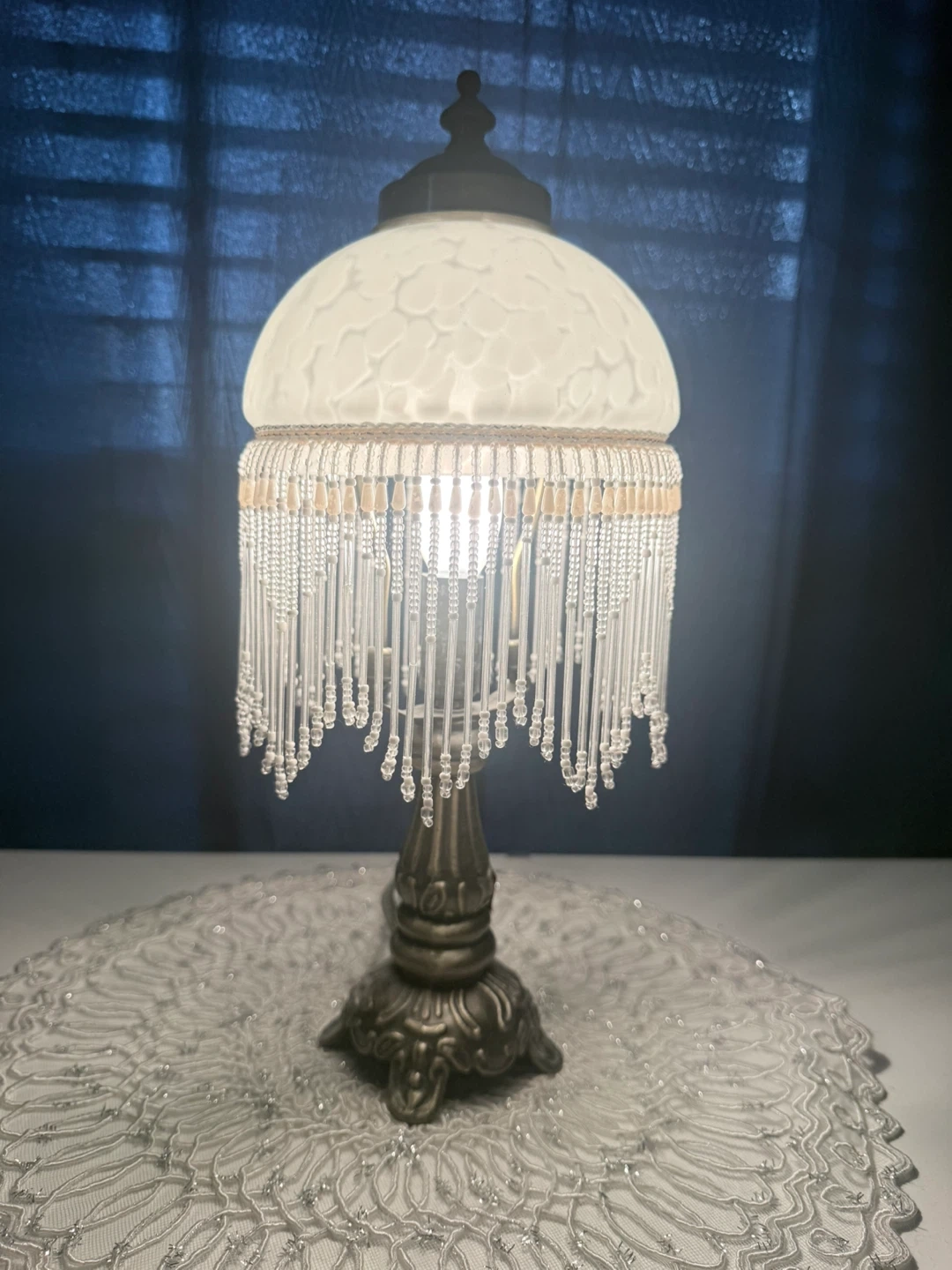 Vintage Frosted Glass Table Lamp with Beaded Fringe