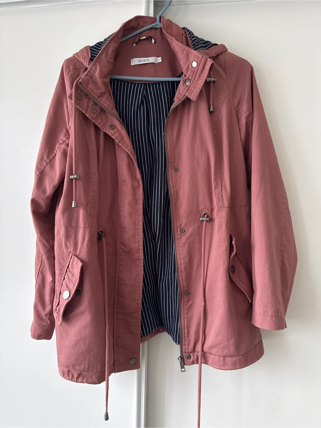 I'm selling a Ricki's hooded jacket in a lovely pink colour. It's a size small and features a striped lining. Perfect for those cooler days!