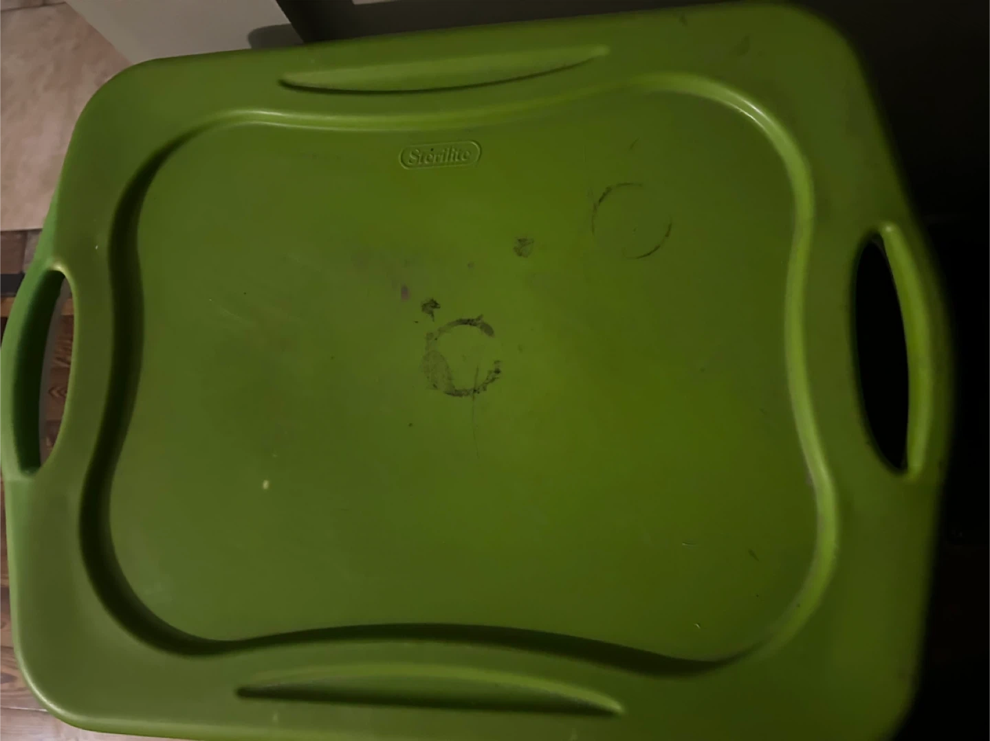 This is a Sterilite storage bin with a 70-quart capacity. It measures 24.6 inches long, 18 inches wide, and 13.75 inches high. The clear plastic bin comes with a lime green lid. It's perfect for organizing your home!