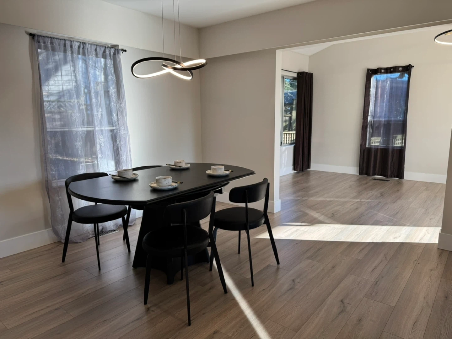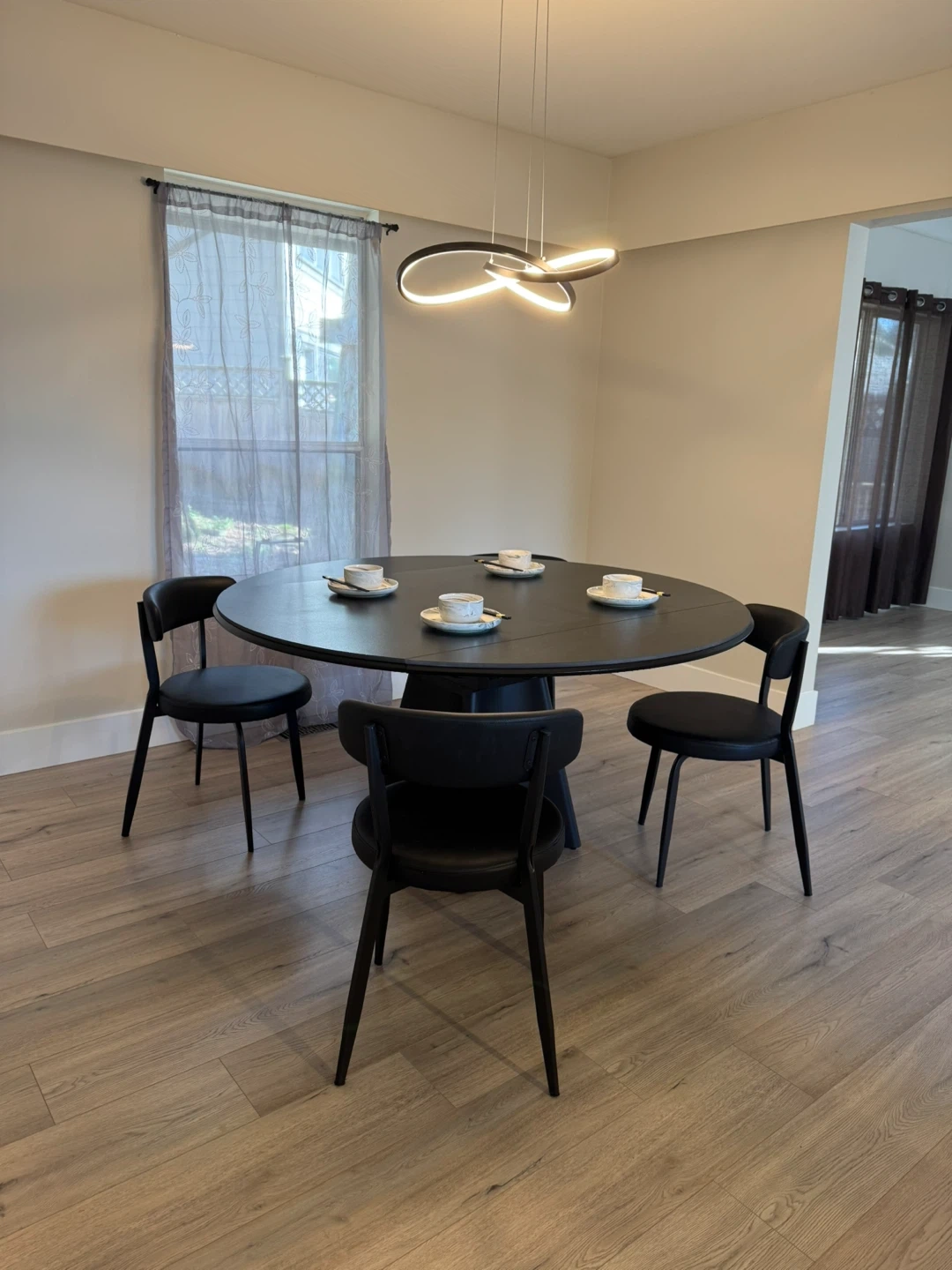 Very sturdy Black oval dining table that extends to a round shape. Seats 4-6 people comfortably. Extra strengthened metal frame for the stone countertop with black metal leg. Size : 1500mm (Diameter). Includes four black chairs.