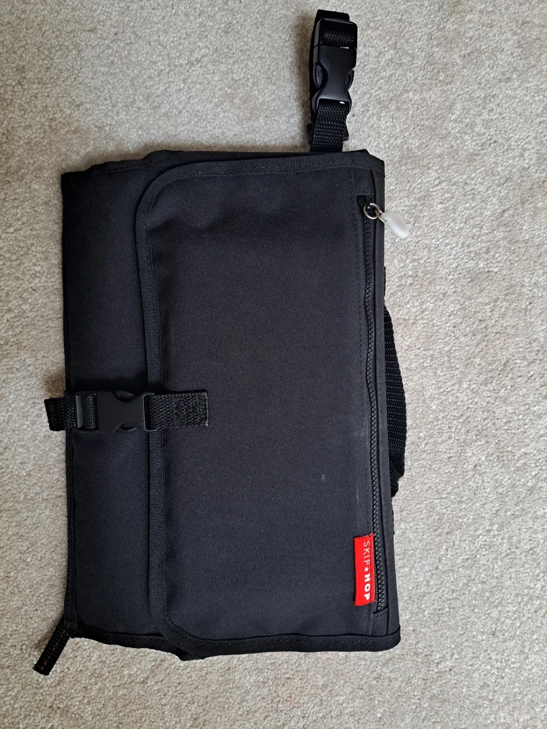 This Skip Hop changing pad kit includes a portable changing pad and a red wipe case. It's designed for on-the-go diaper changes. The pad folds compactly for easy transport.