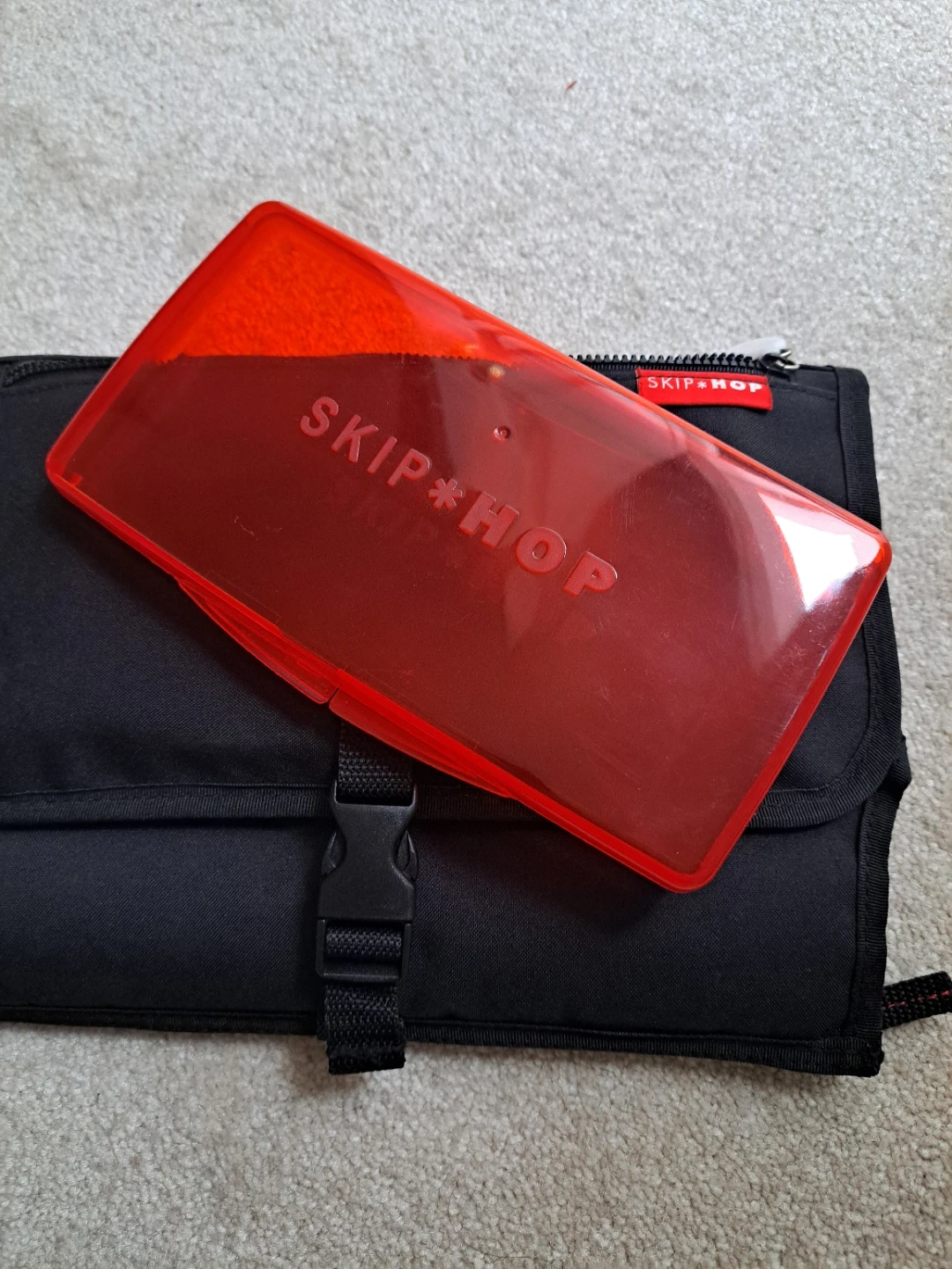 This Skip Hop changing pad kit includes a portable changing pad and a red wipe case. It's designed for on-the-go diaper changes. The pad folds compactly for easy transport.