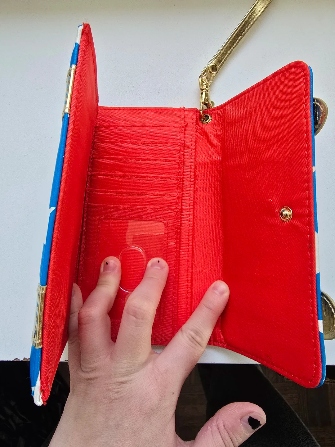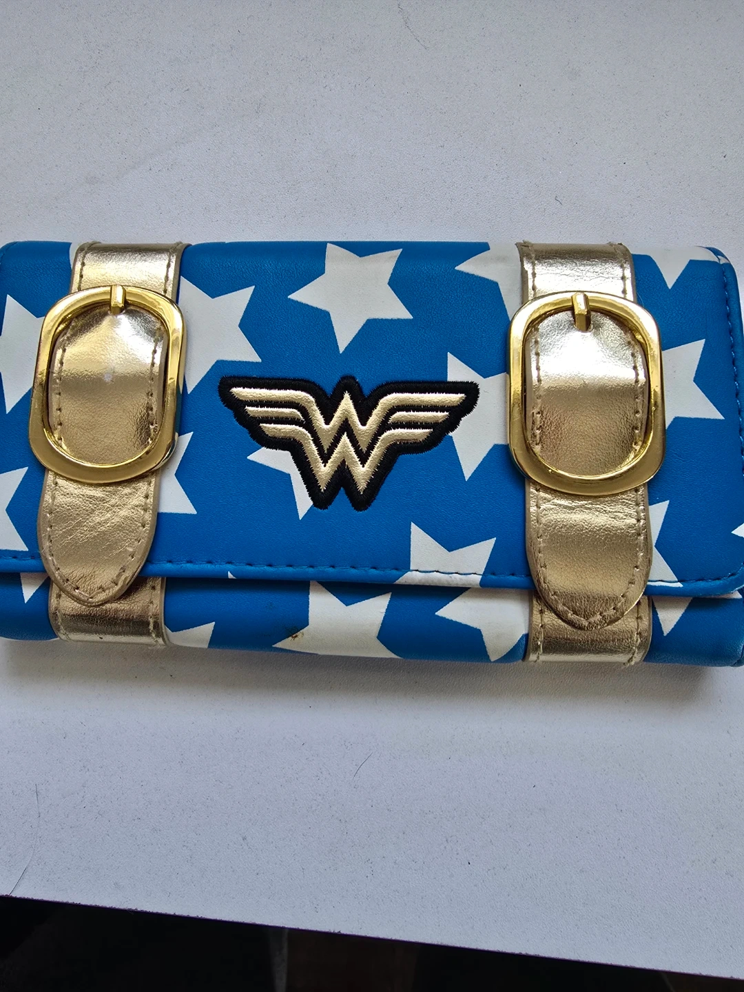 This wallet features the iconic Wonder Woman logo and star pattern. It's blue with white stars and gold buckle accents. Inside, it has multiple card slots and a clear ID window.