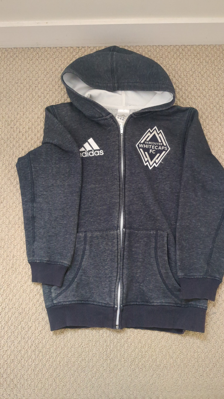 Here's an Adidas hoodie featuring the Vancouver Whitecaps FC logo. It's in great shape and ready for a new home! Perfect for any young soccer fan. Fits 11 to 12 years old. Pick up Nanaimo Skytrain Station.