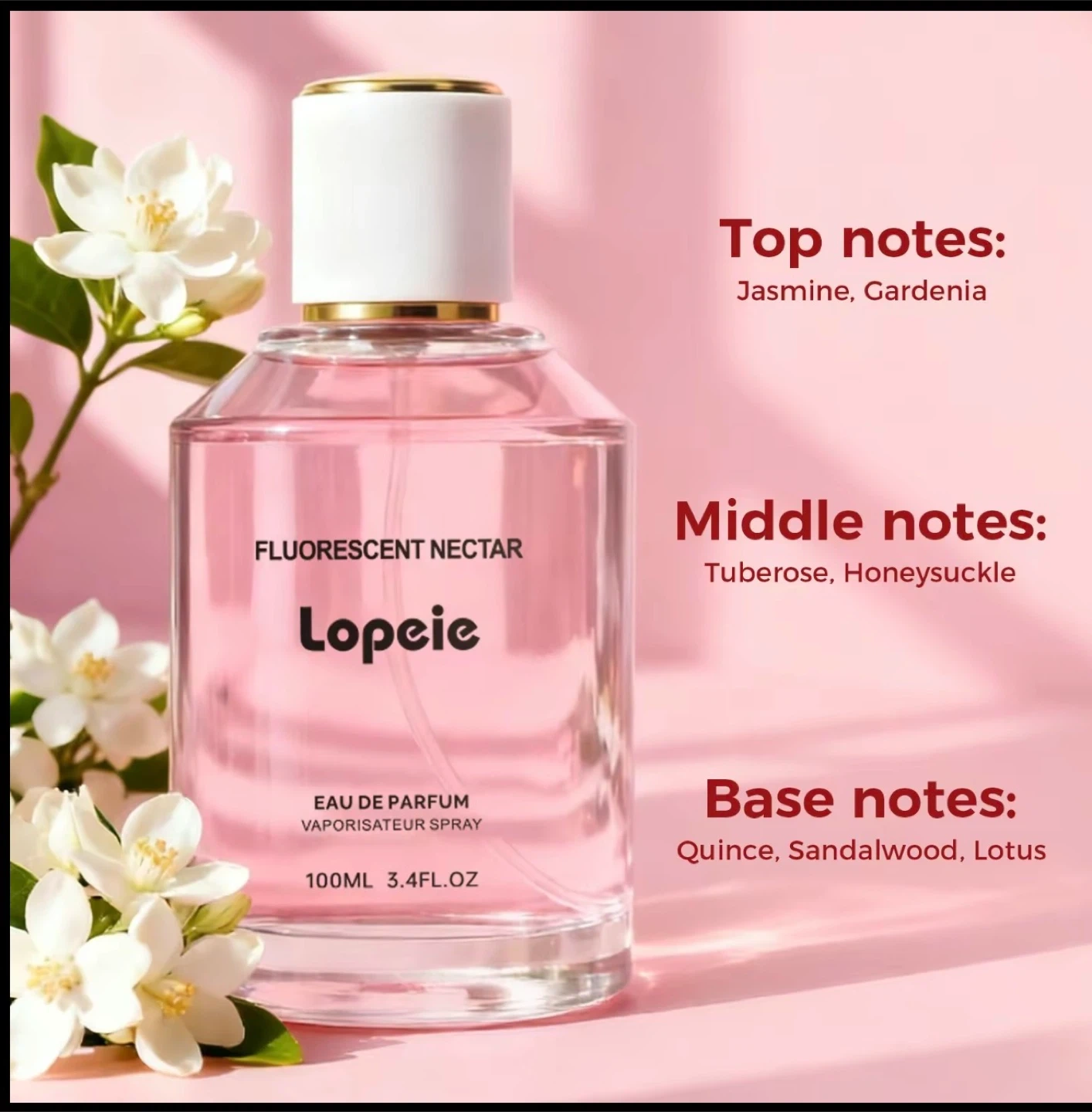 This is Lopeie Fluorescent Nectar Eau de Parfum spray. It comes in a 100ml (3.4 fl oz) bottle. Top notes include Jasmine and Gardenia, with Tuberose and Honeysuckle in the middle, and Quince, Sandalwood, and Lotus as base notes.
