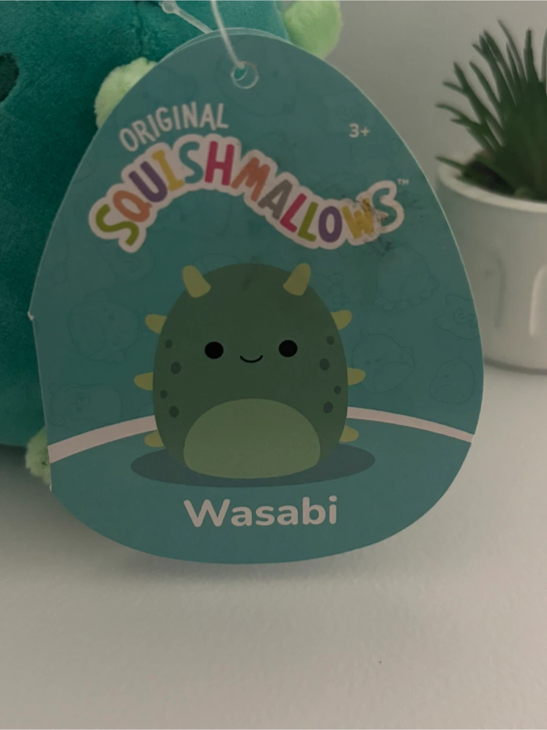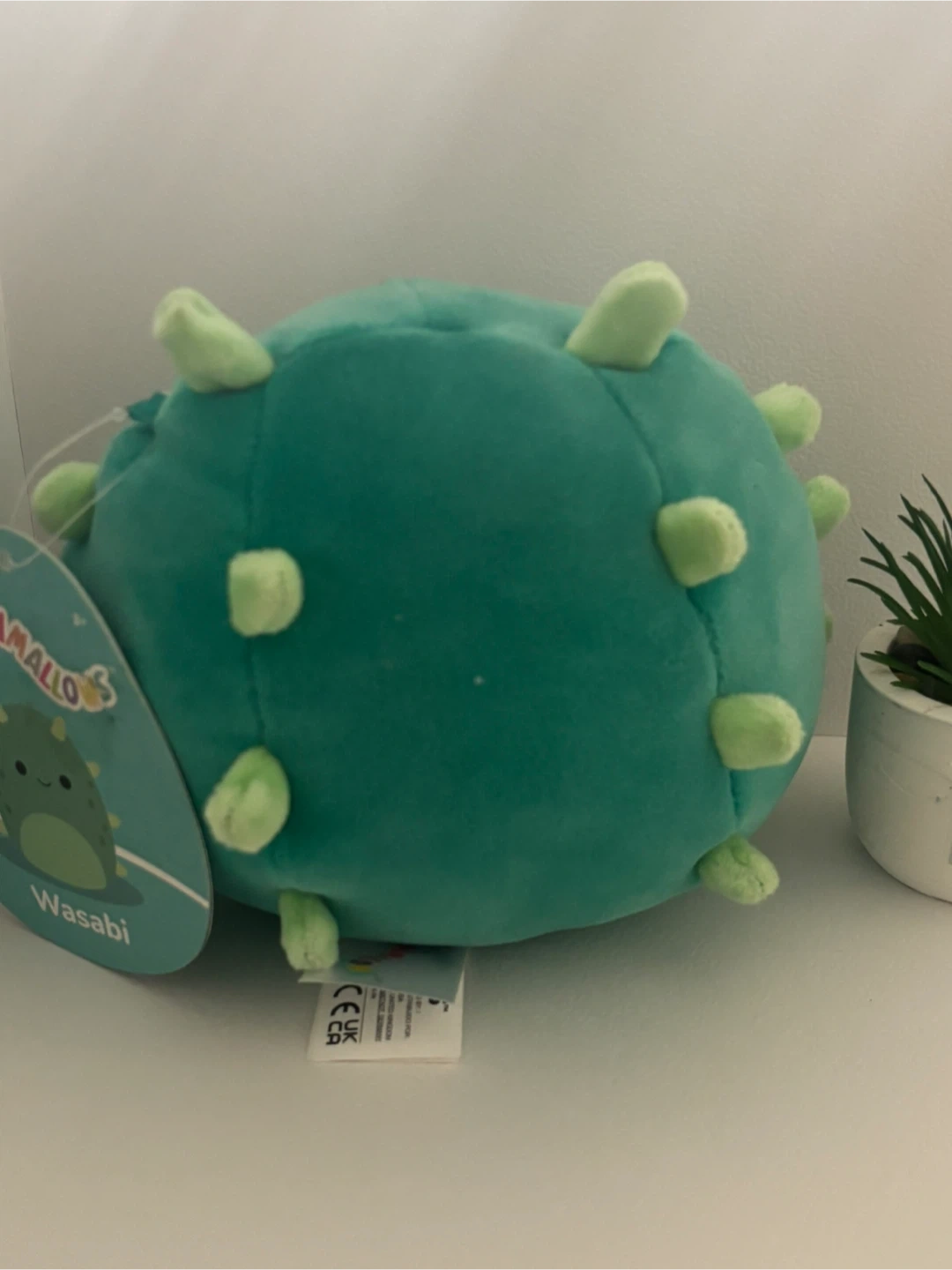 This is a Jazwares Squishmallow named Wasabi. It's a teal plush toy with light green spikes and a round body. This toy is suitable for ages 3 and up. It's made with soft, huggable material.