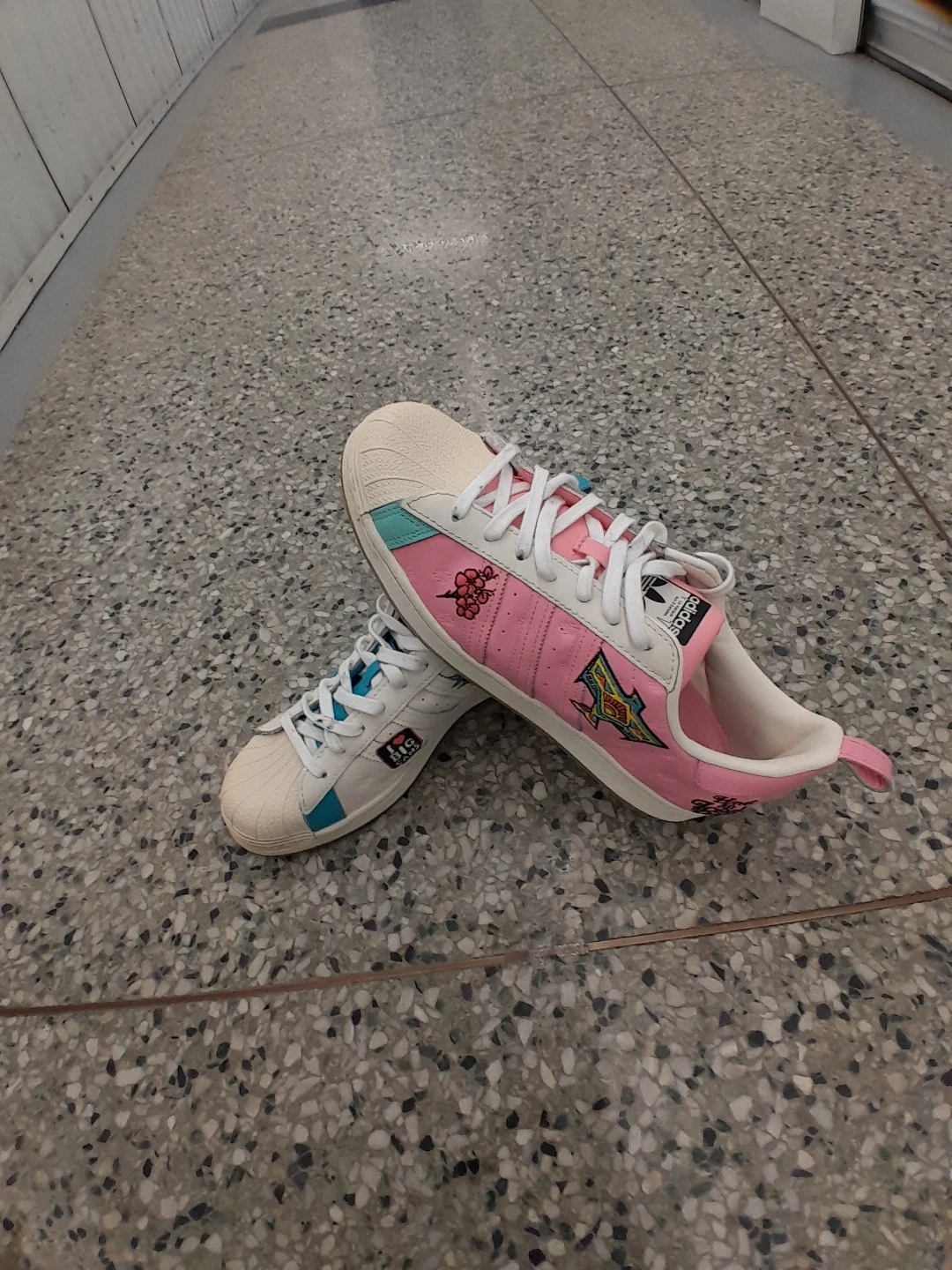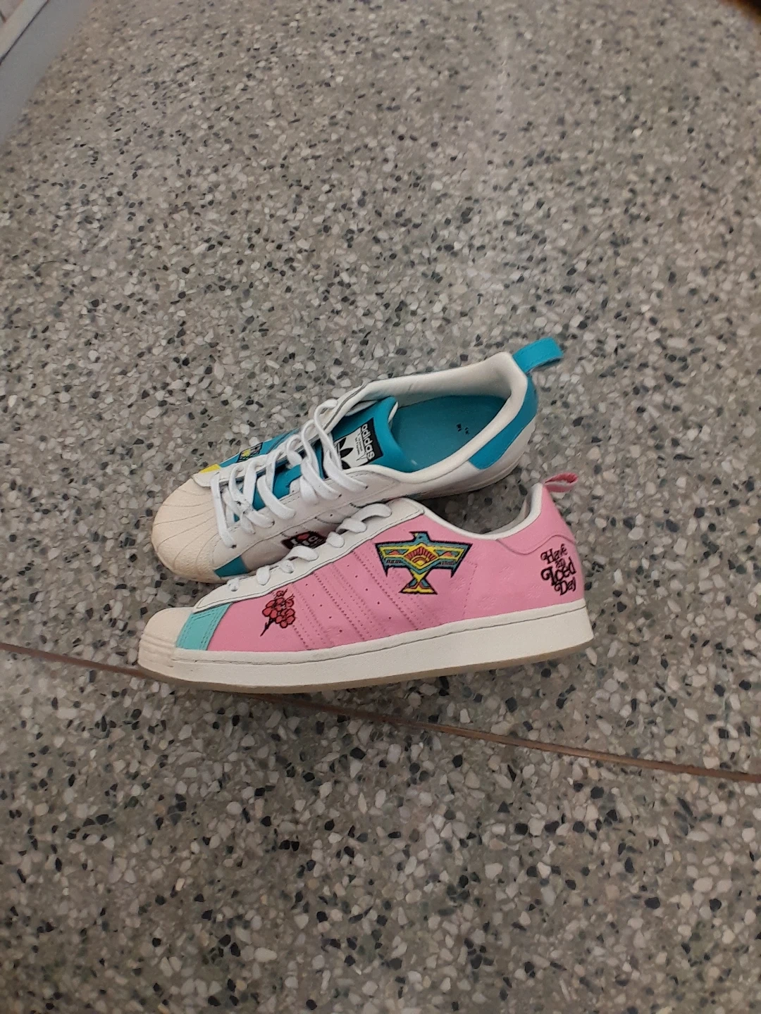 Adidas Superstar sneakers featuring a "Have an Iced Day" design. These shoes have a white shell toe and white laces. One shoe has pink accents and graphics, while the other has light blue accents size 10