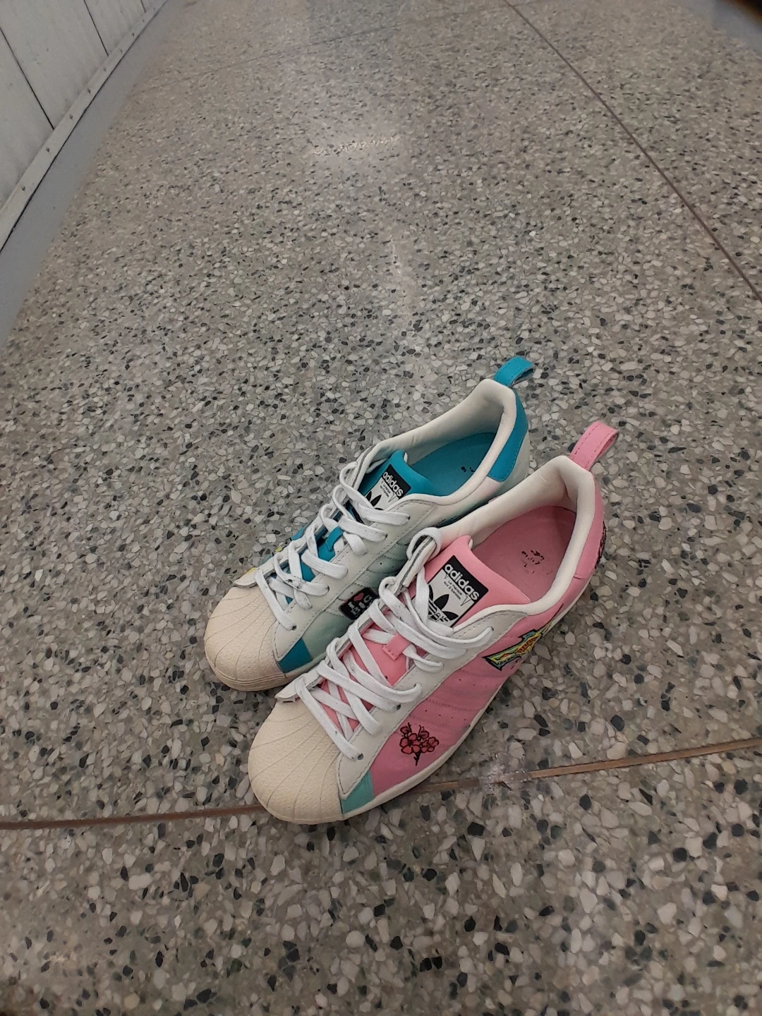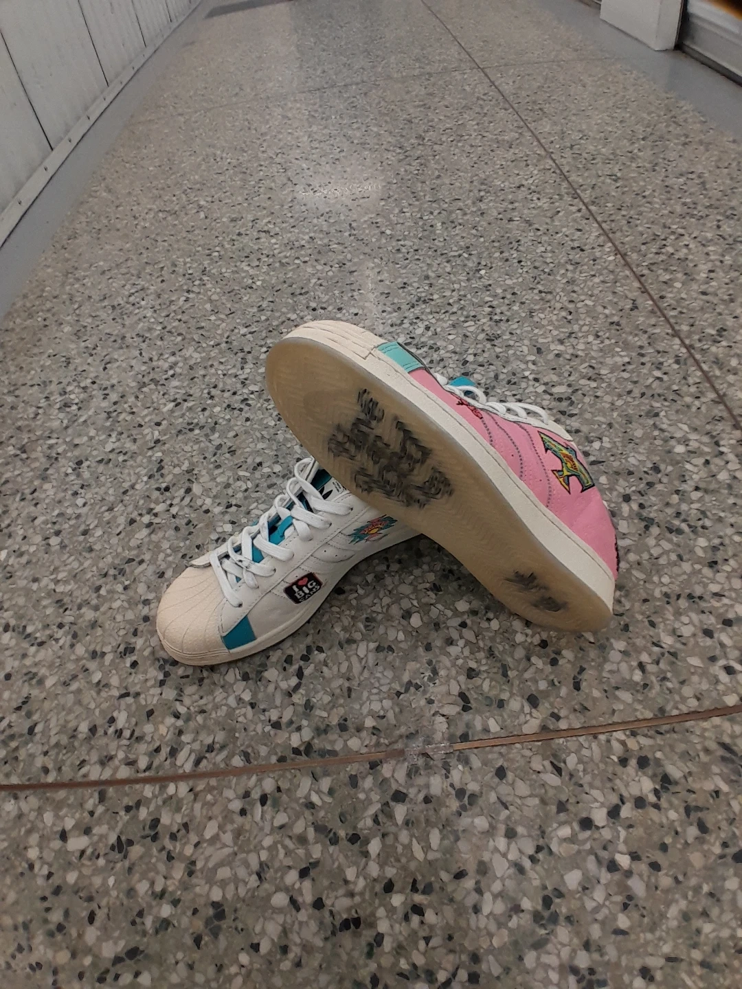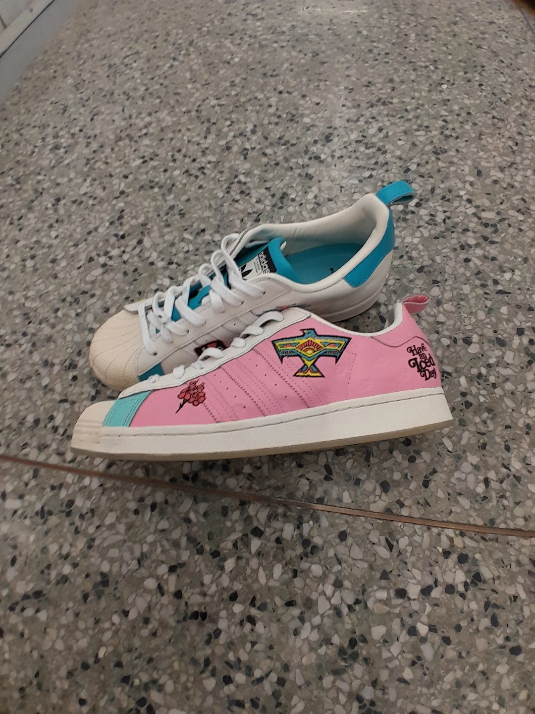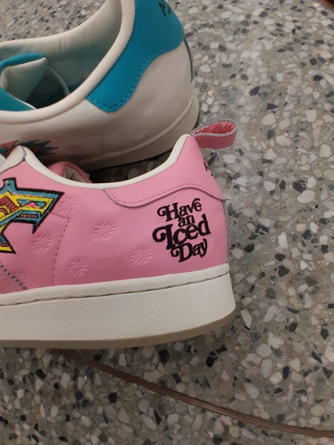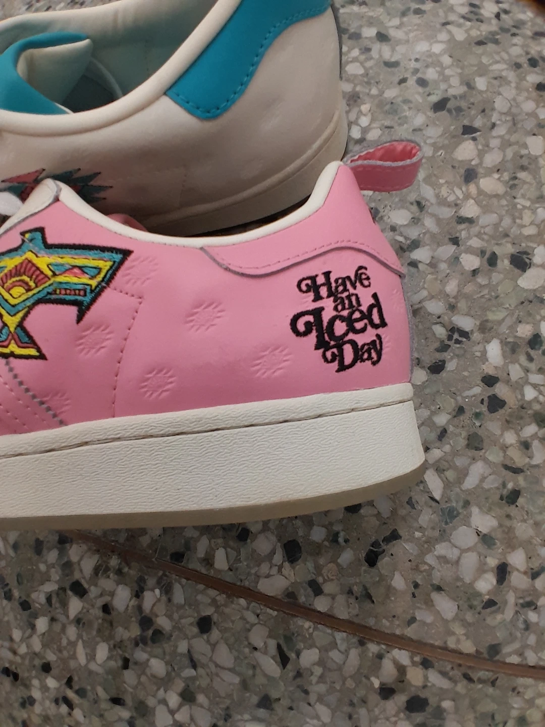 Adidas Superstar sneakers featuring a "Have an Iced Day" design. These shoes have a white shell toe and white laces. One shoe has pink accents and graphics, while the other has light blue accents size 10