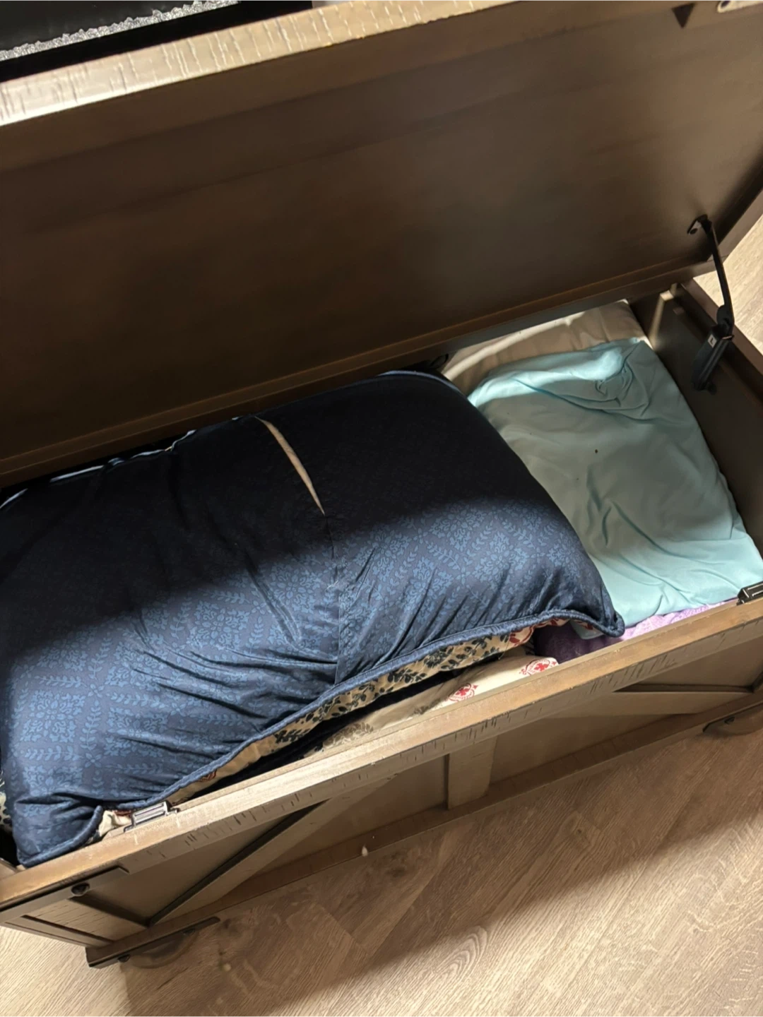 This wooden coffee table offers ample storage space inside. It's great for keeping your living room tidy. The hinged lid provides easy access to the storage compartment. Its rustic design fits well with various decor styles.