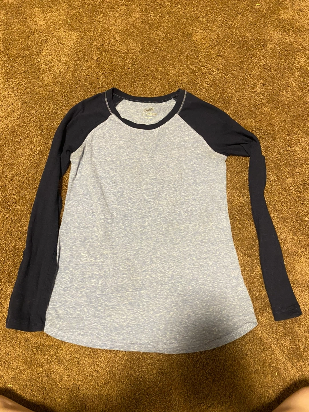 This is a long-sleeved baseball tee from Justice. It's light blue with navy sleeves. A comfy top for everyday wear!