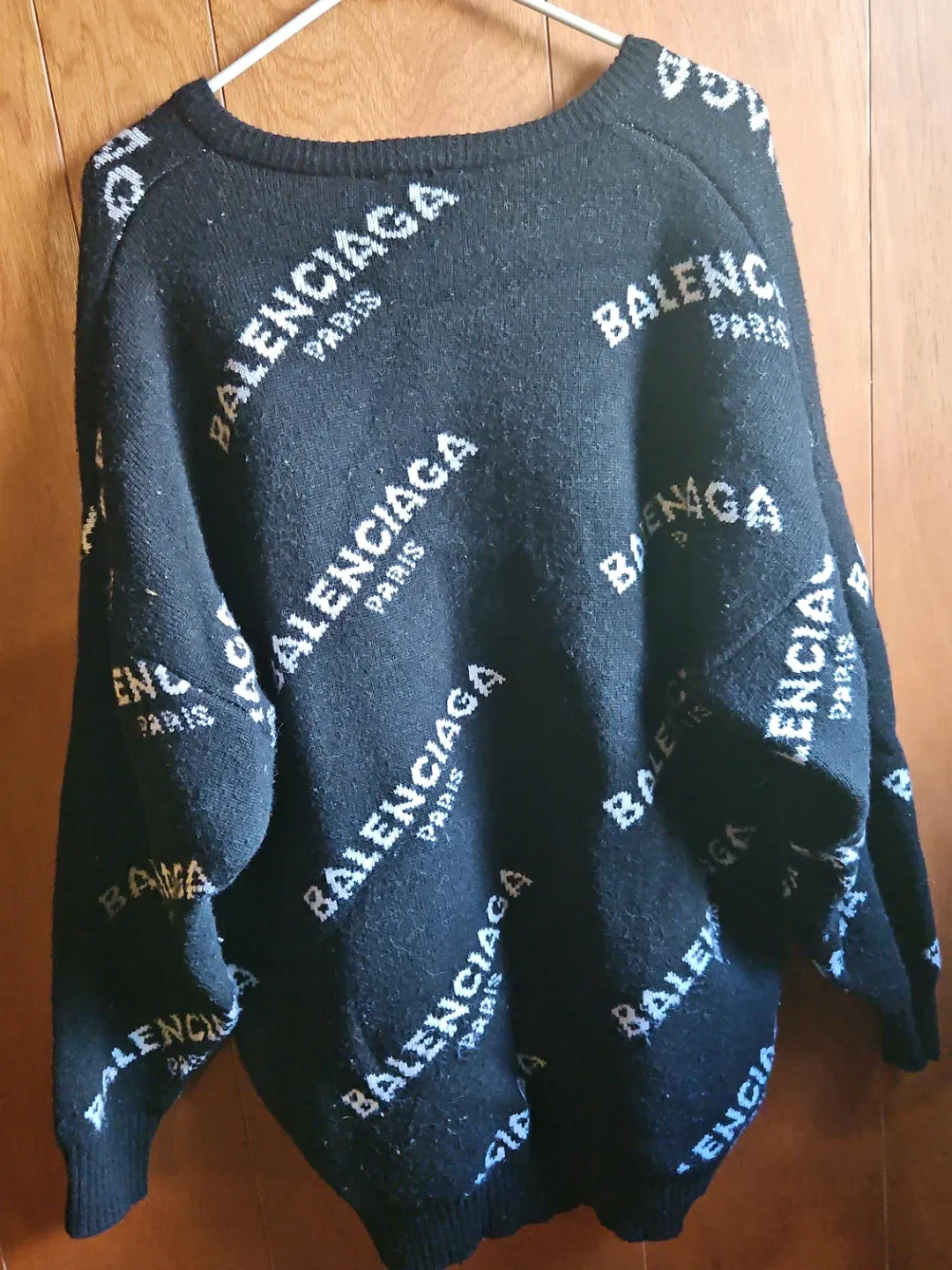 This is a black Balenciaga knit sweater featuring an all-over white logo print with 'Paris' accents. It's a stylish piece for a wardrobe. Its knit construction offers warmth and comfort.