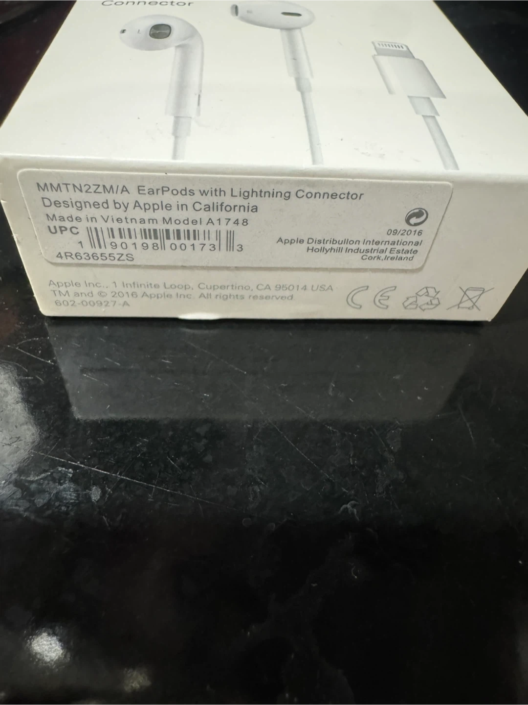 Selling a brand new pair of Apple EarPods with a Lightning Connector. These are designed by Apple in California and made in Vietnam. The model number is MMTN2ZM/A, and they come in their original box. Perfect for anyone needing a reliable set of wired earbuds!
