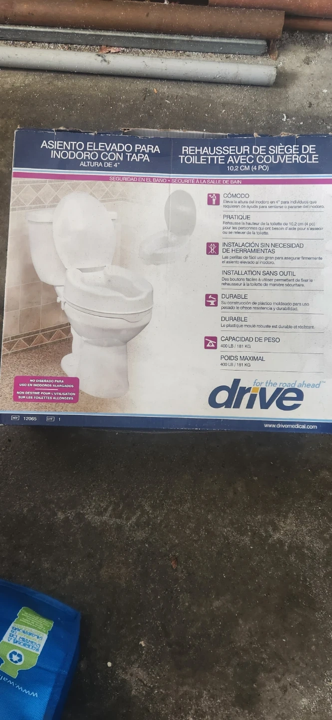 This Drive toilet seat elevates your toilet by 4 inches for easier sitting and standing. It's made of durable molded plastic and requires no tools for installation. The maximum weight capacity is 400 lbs. (Open box was never used)