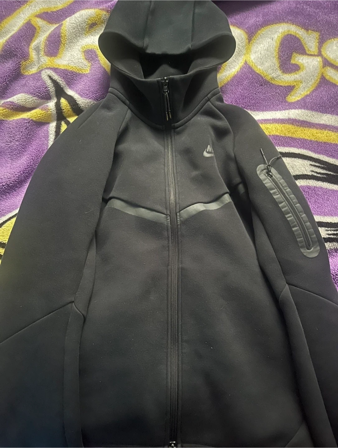 Black Nike Tech Fleece full zip hoodie with a hood and zippered pockets. Matching black Tech Fleece joggers with zippered pockets. Comfortable set for everyday wear.