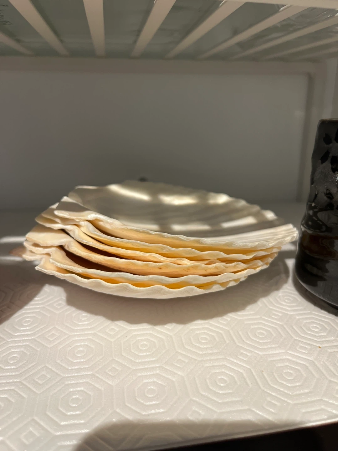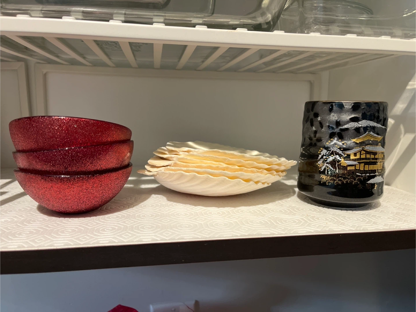 Three sparkly red berry bowls stacked together, perfect for snacks or decoration. Also includes a black decorative tea cup with a gold pagoda design.