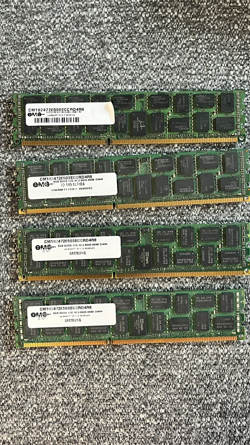 Selling a kit of four 8GB DDR3 ECC RDIMM modules. These are EMS branded and compatible with servers requiring this type of memory. Each stick is 8GB and ECC registered. This RAM kit is ideal for upgrading server performance.