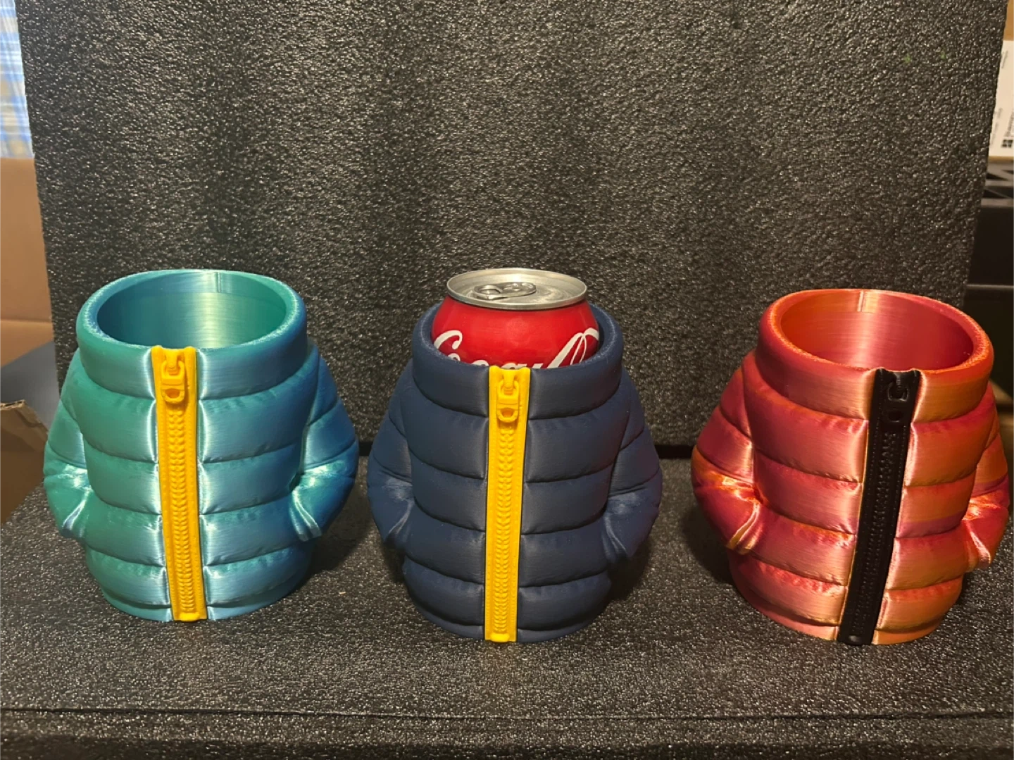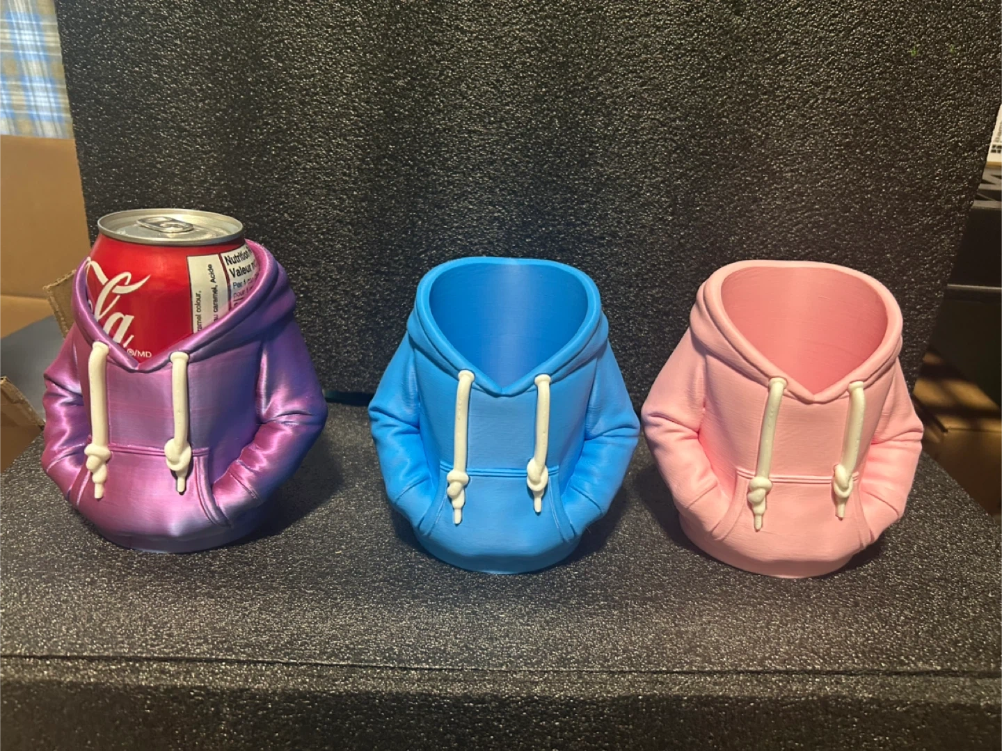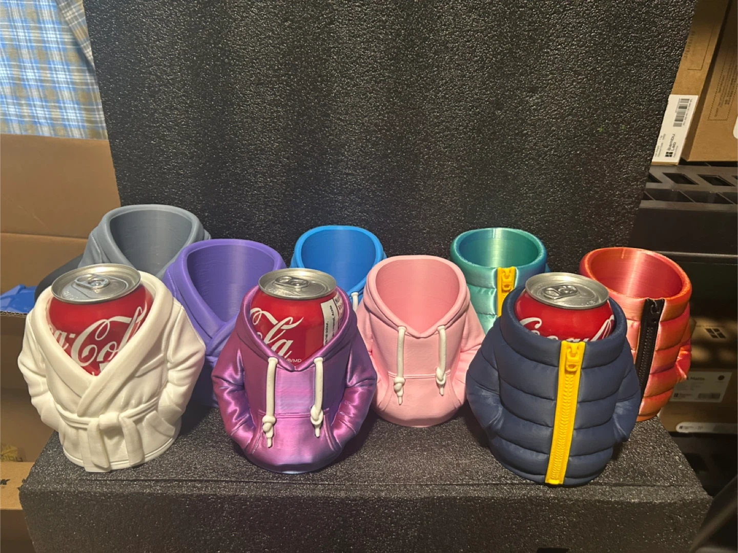 These 3D printed can coolers come in fun hoodie and bathrobe designs. They're great for keeping your drinks cool and adding some personality to your beverage. Made from durable plastic.