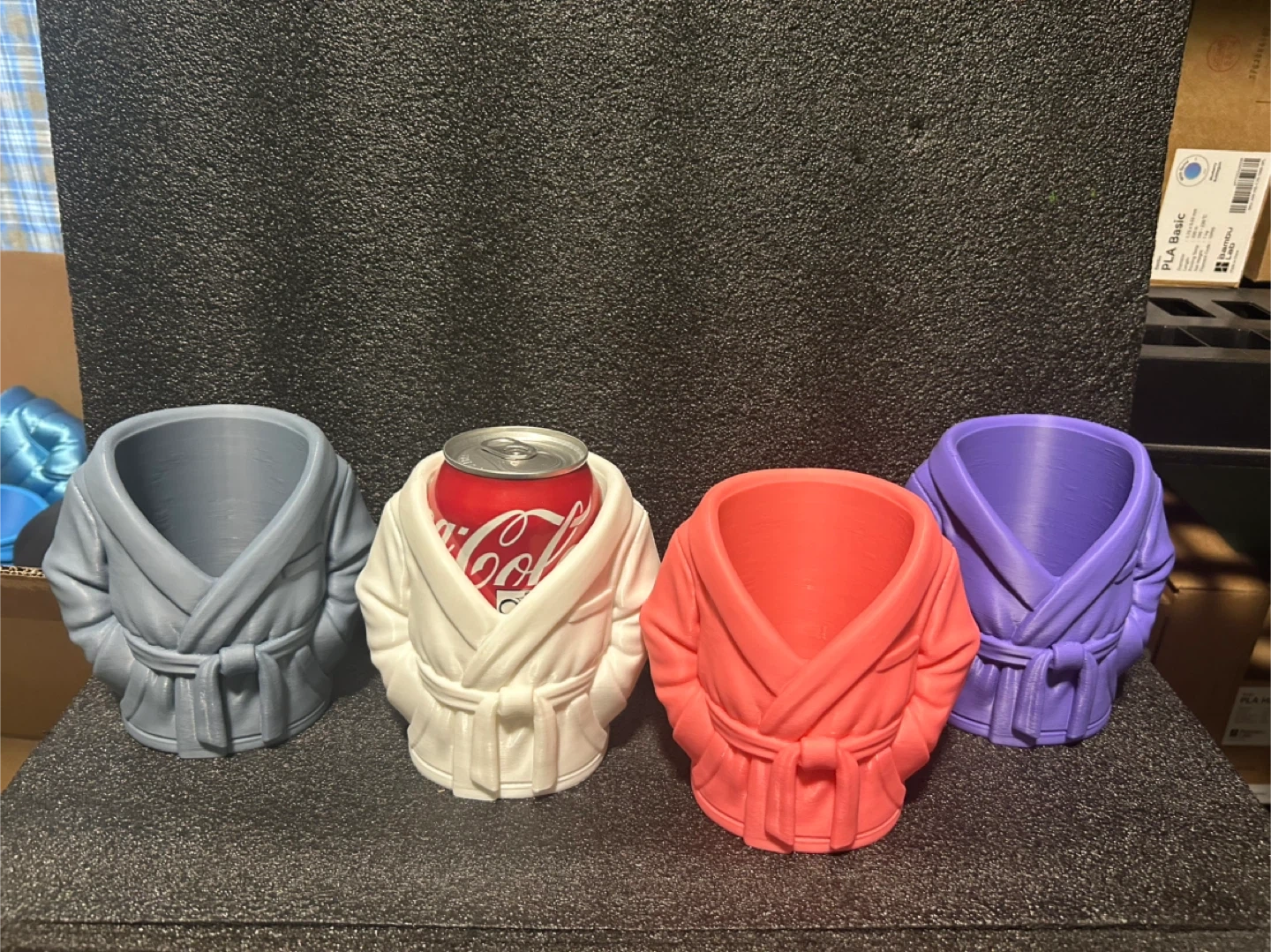 These 3D printed can coolers come in fun hoodie and bathrobe designs. They're great for keeping your drinks cool and adding some personality to your beverage. Made from durable plastic.