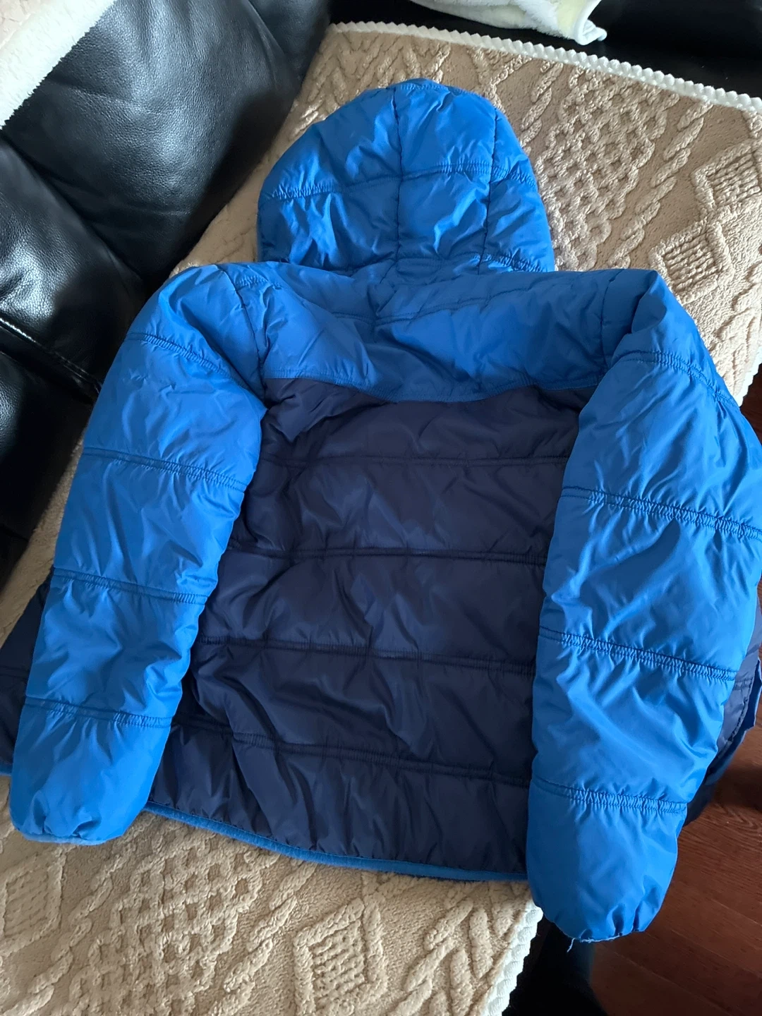 A Eddie Bauer boys' puffer jacket in blue and navy, size Small 7/8. It's a hooded design with a full zipper. This jacket is warm and good for cooler weather.