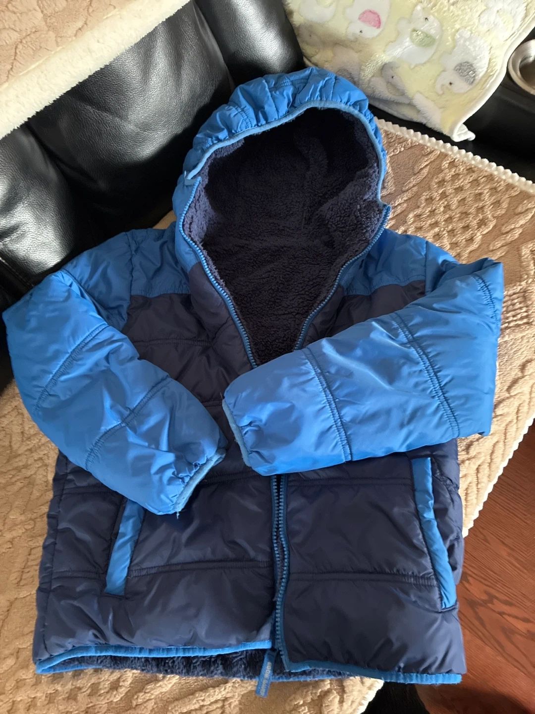 A Eddie Bauer boys' puffer jacket in blue and navy, size Small 7/8. It's a hooded design with a full zipper. This jacket is warm and good for cooler weather.