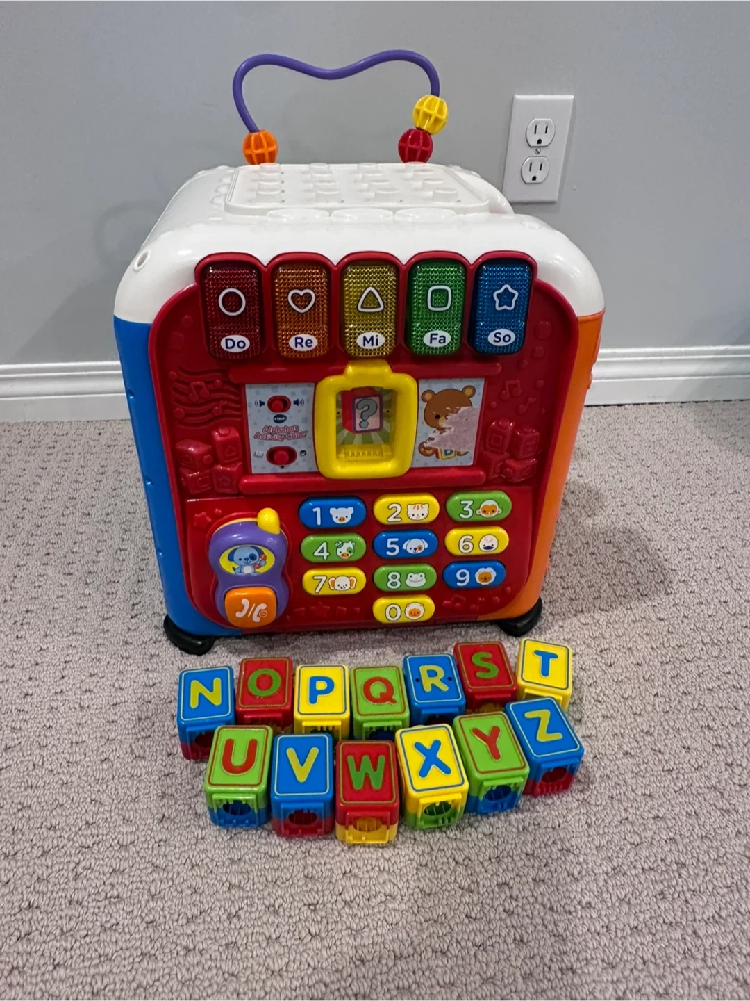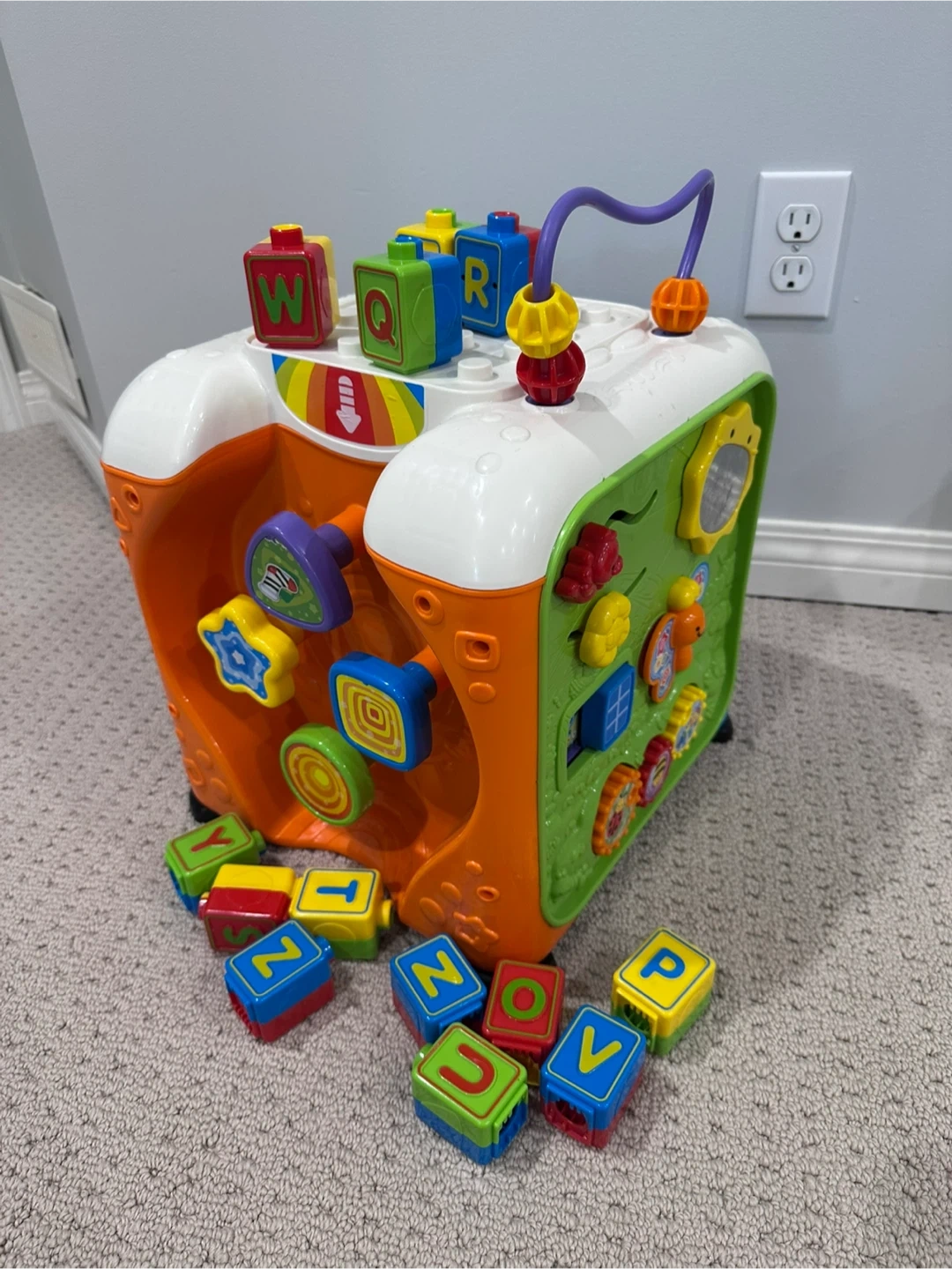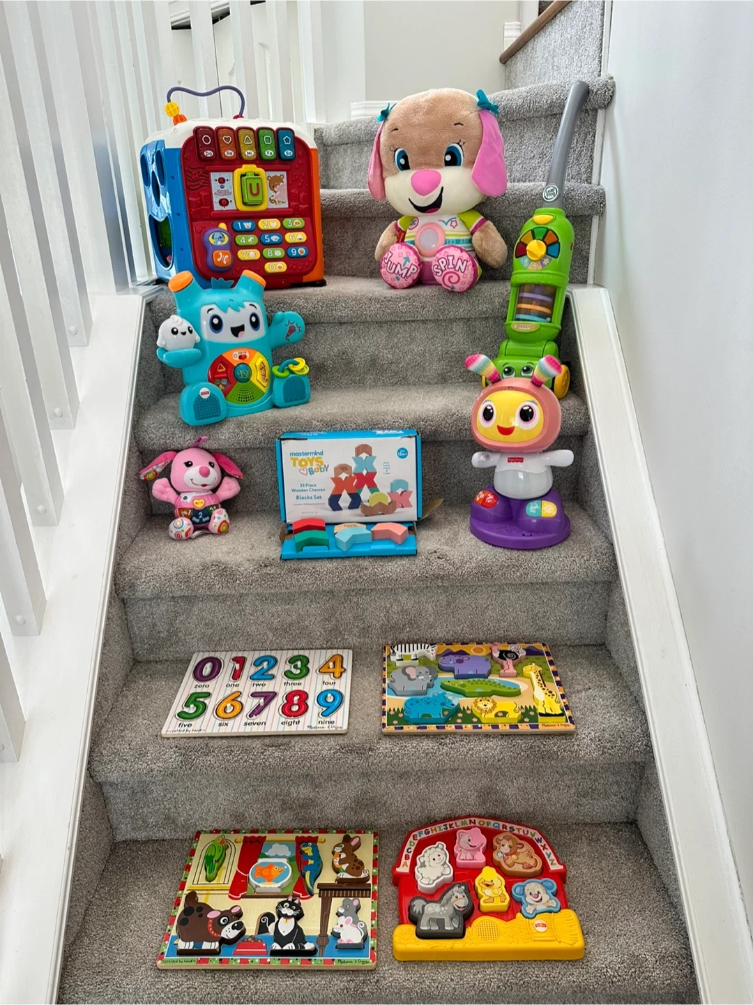 Bundle of learning toys including a Fisher-Price Laugh & Learn Puppy, a V-teck alphabet activity cube, a Fisher-Price dance and groove Rock it Bilingual toy, a Fisher Price Beatbo robot, a LeapFrog vacuum toy, a V-teck cuddle and sing puppy, a Mastermind 33 piece Wooden block set and assorted puzzles (all working-batteries included). Pet-free and smoke free house. Cash transactions only please! Thank you