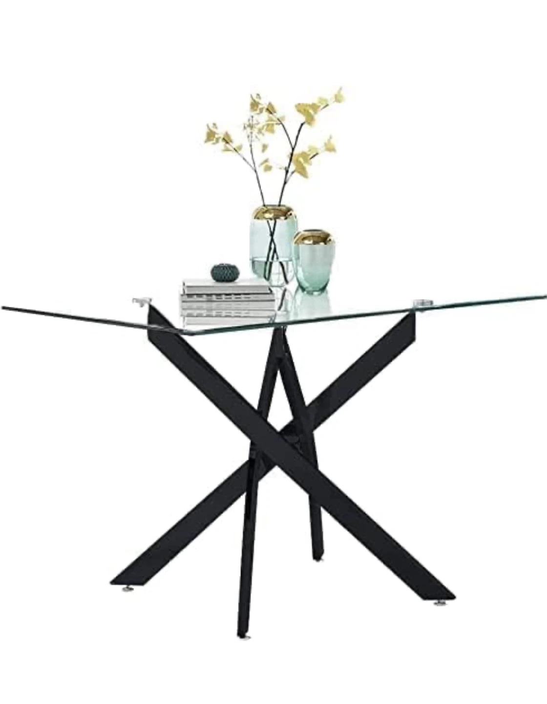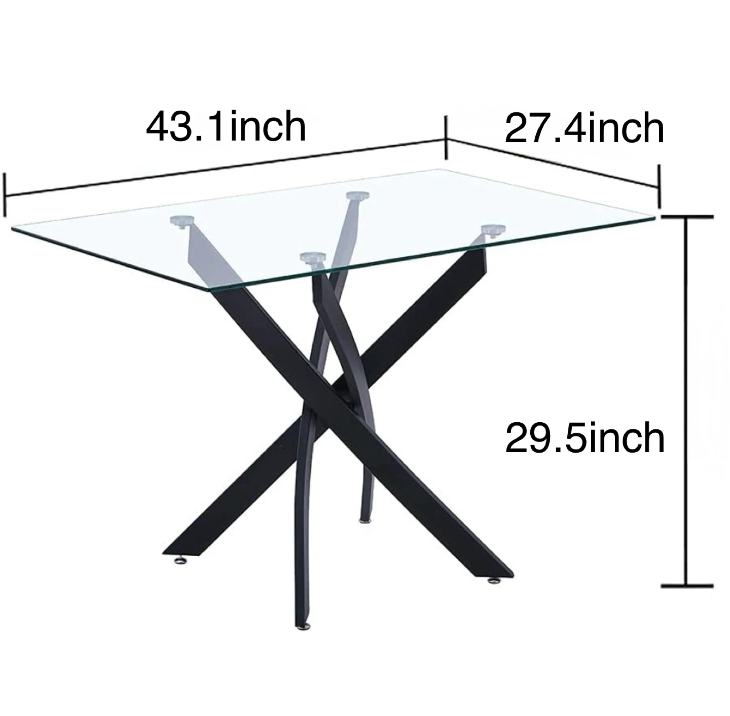 Rectangular glass-top dining table with a modern black metal spider-leg base. Dimensions are 43.1 inches long by 27.4 inches wide by 29.5 inches high. It's a stylish table for any dining space!