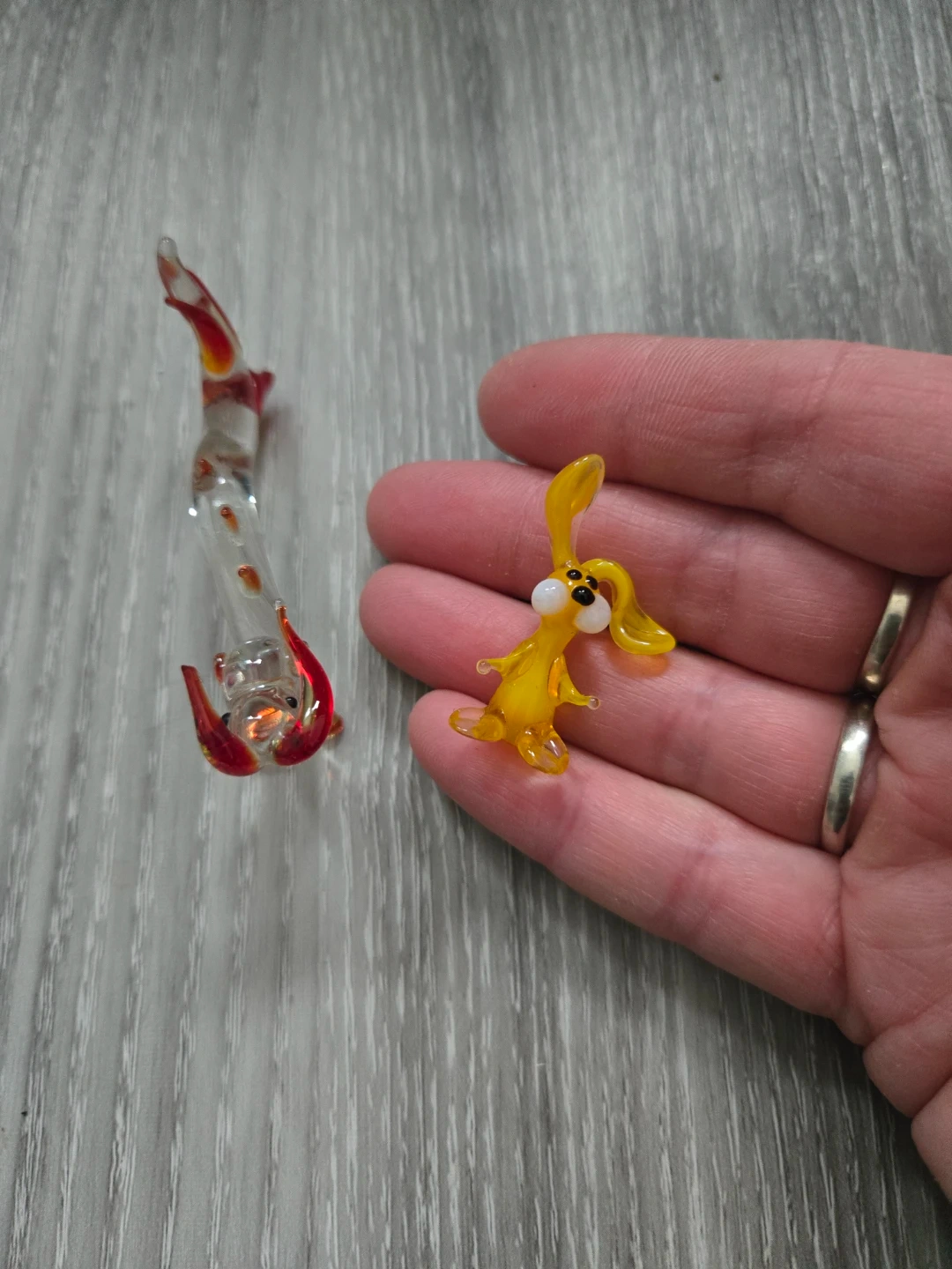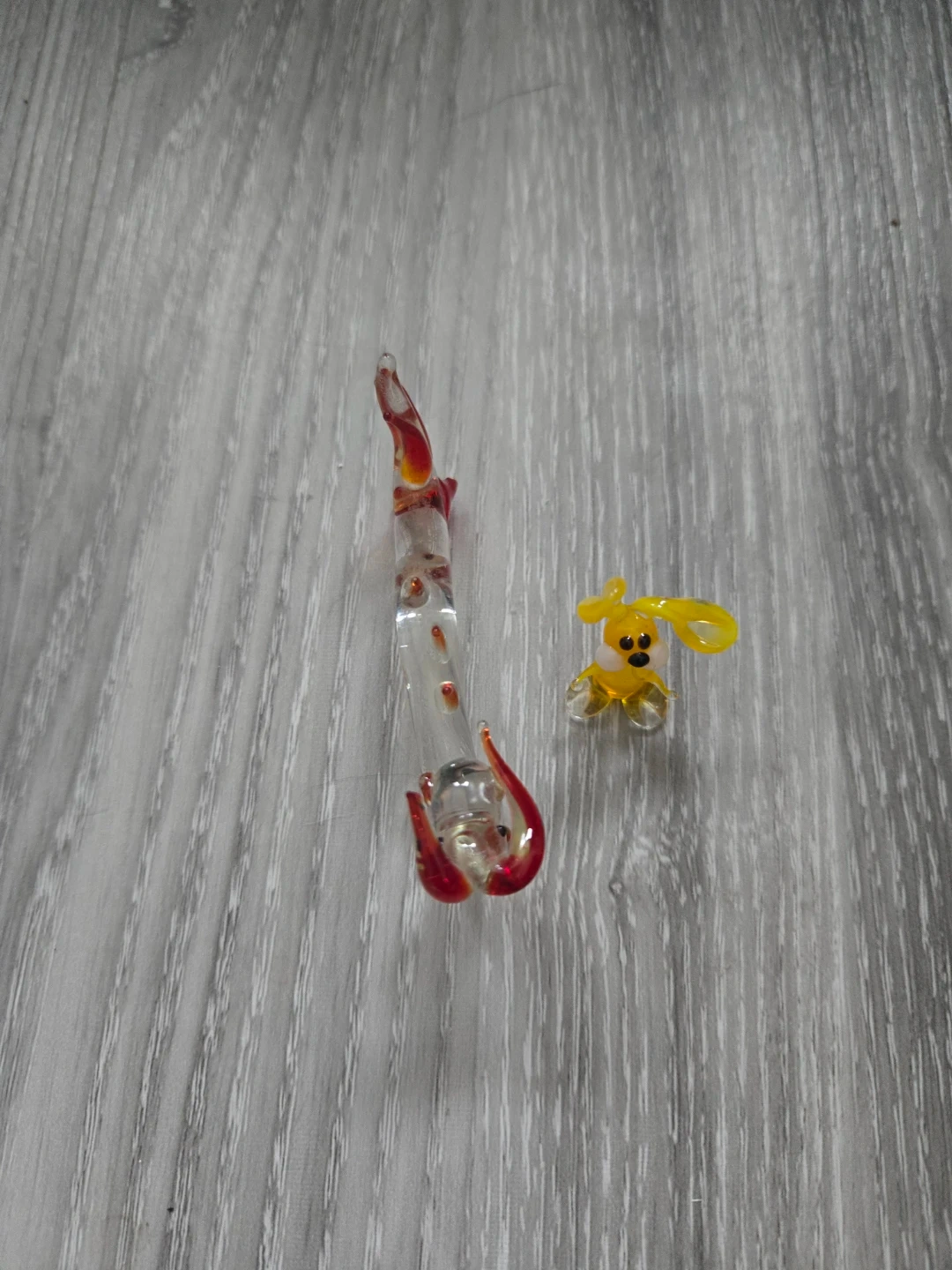 Two tiny decorative glass animal figurines. One is a yellow bunny with black eyes and a white belly. The other is a clear glass dragon with red accents on its head and tail. These are delicate, handmade glass pieces.