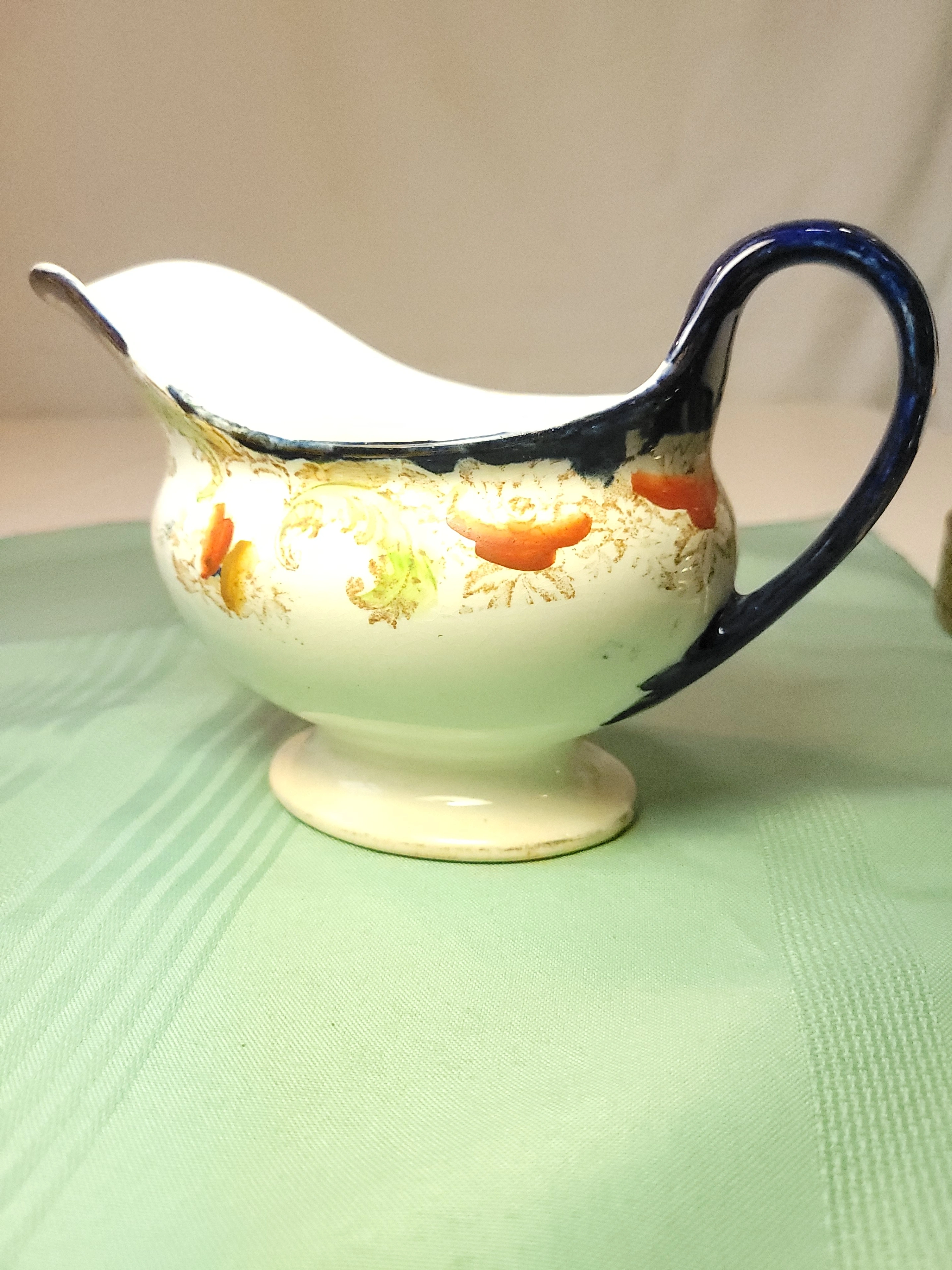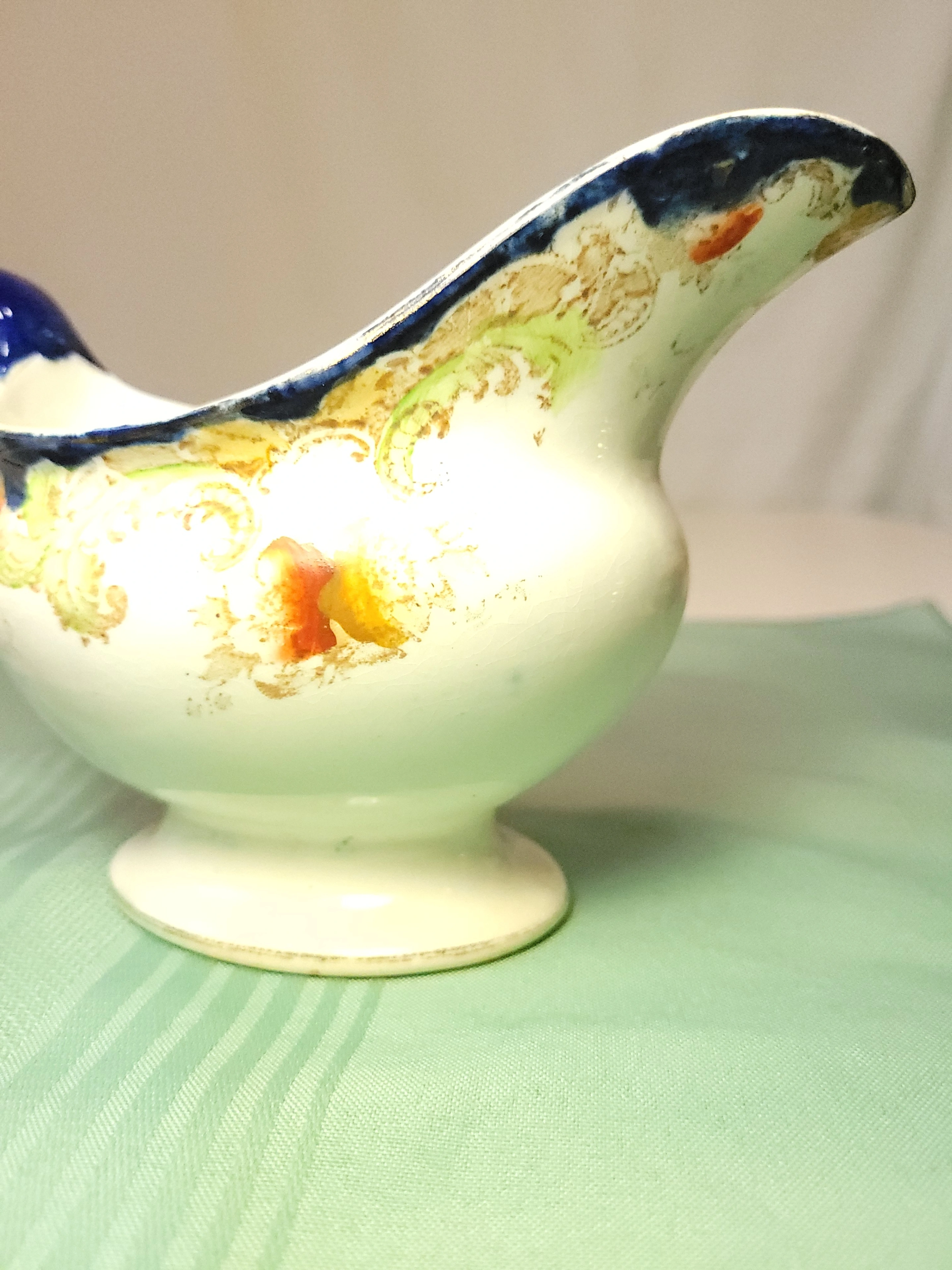 This is an exquisite antique gravy boat by W.H. Grindley & Co. in the highly collectible "Lorne" pattern. Registered in 1898, this piece is a stunning example of late Victorian "clobbered" ware—featuring deep cobalt flow blue transferware accented by hand-painted orange floral motifs and delicate gold gilt highlights along the scalloped rim and handle.