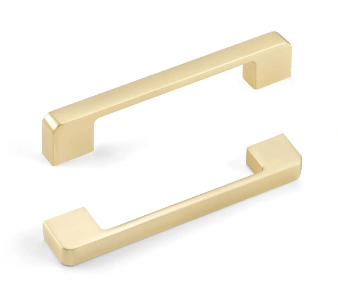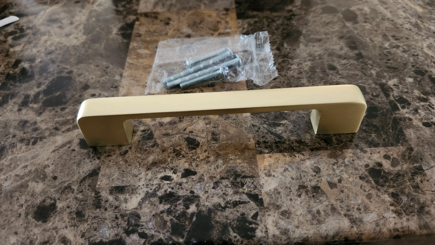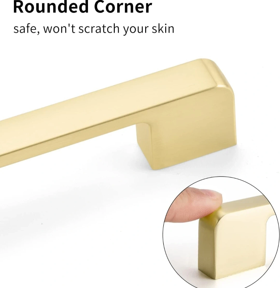 Set of gold cabinet or drawer pulls. Solid zinc alloy construction with a brushed gold finish. Rounded corners for safety. Includes 1 inch and 1.57 inch screws.
