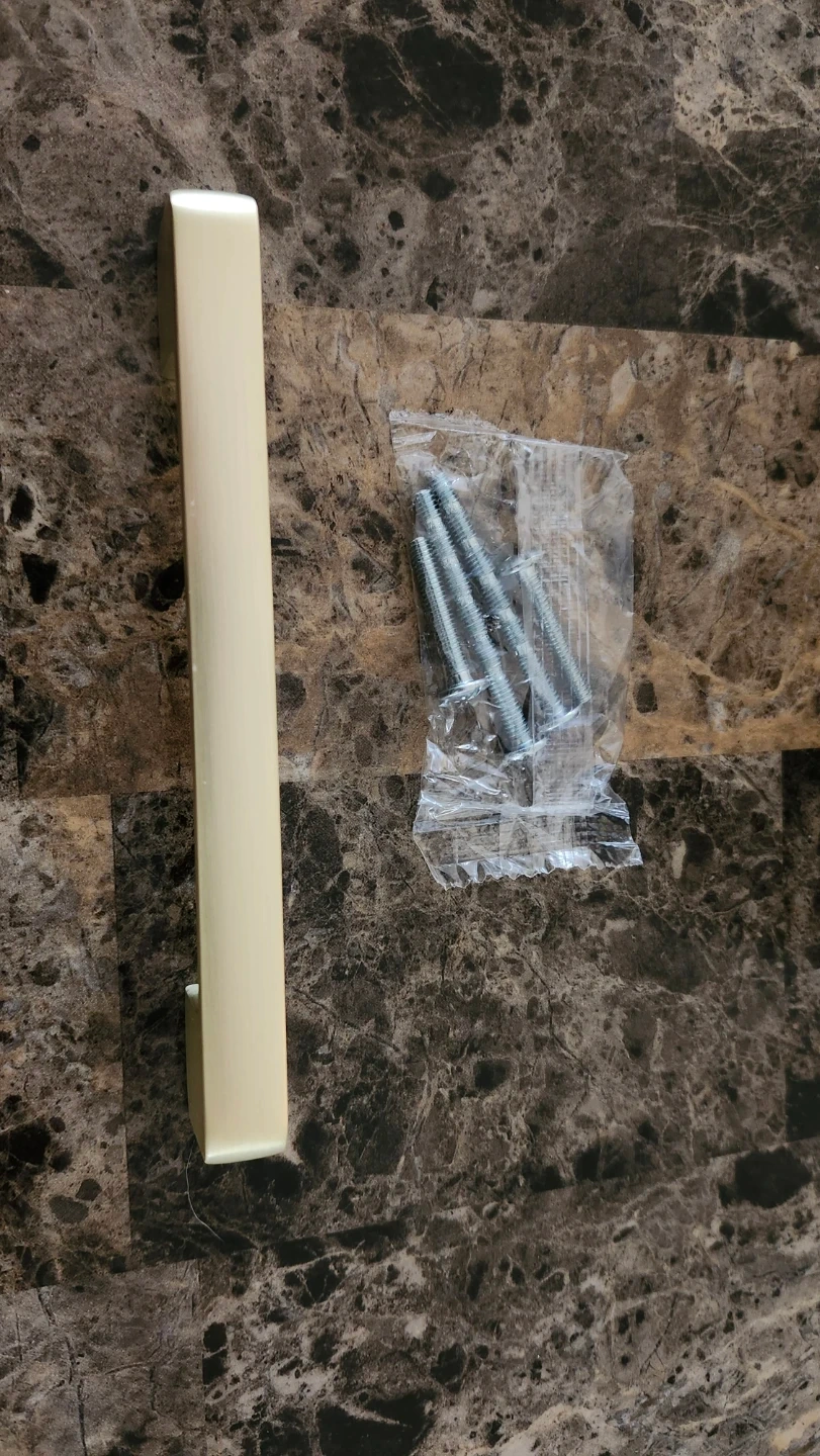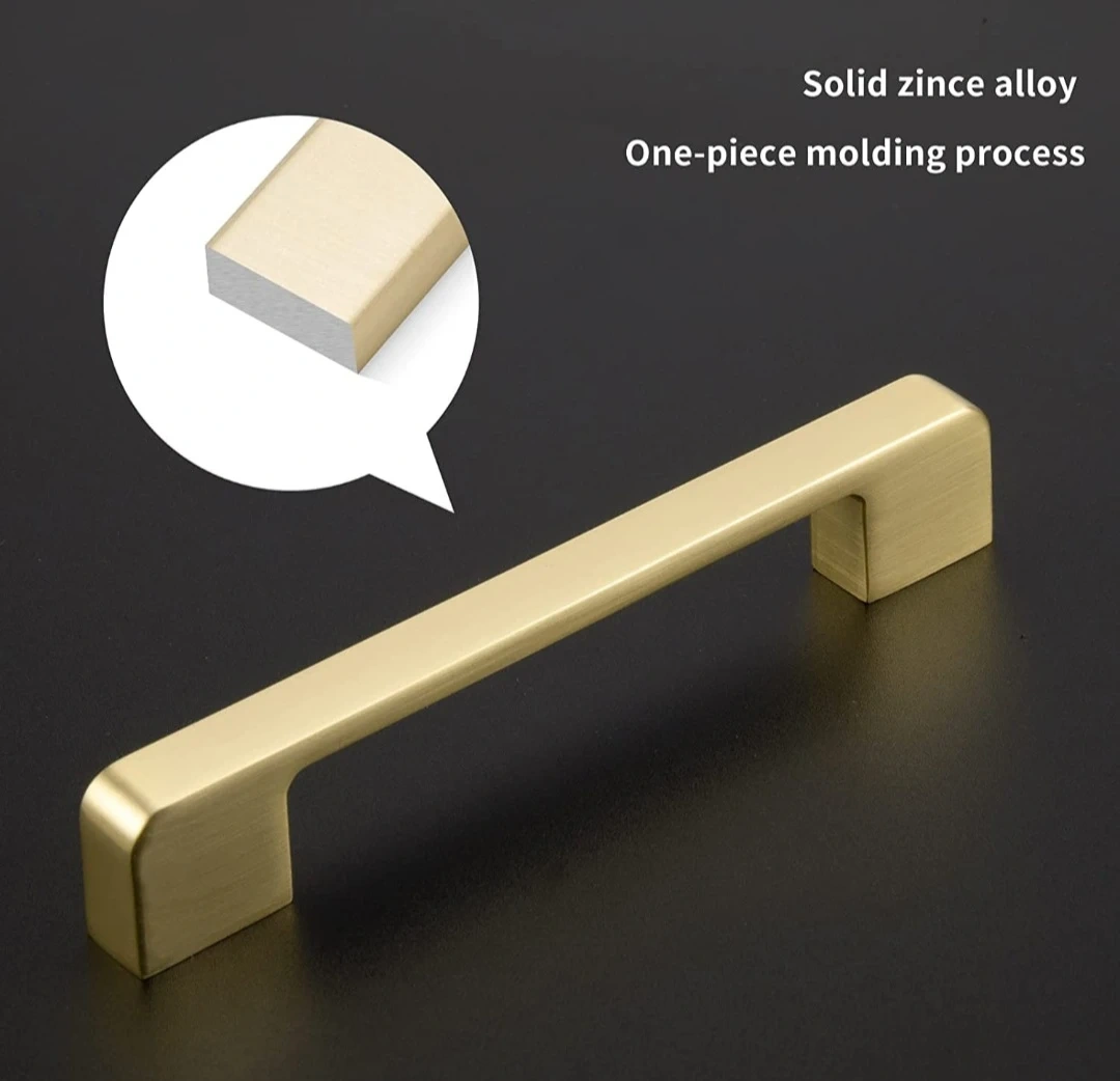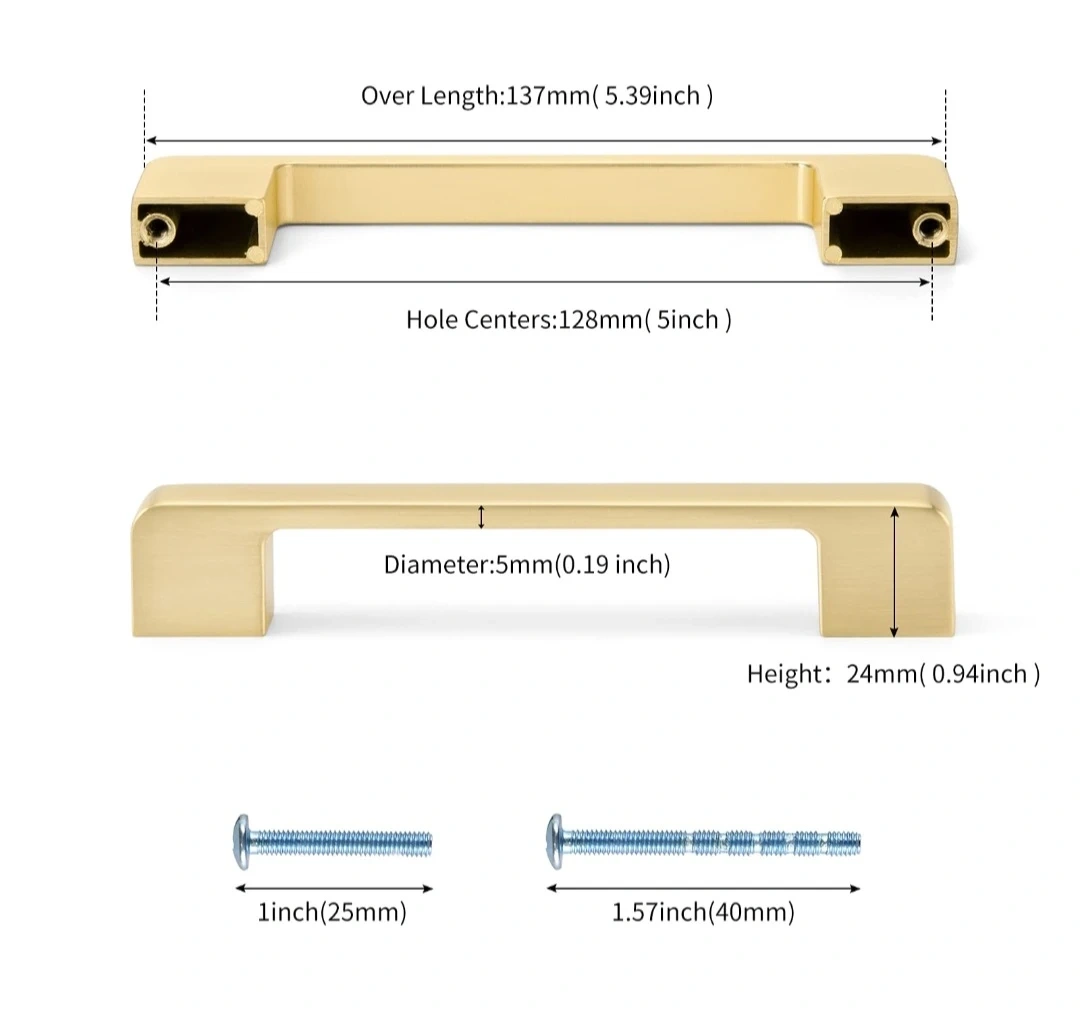 Set of gold cabinet or drawer pulls. Solid zinc alloy construction with a brushed gold finish. Rounded corners for safety. Includes 1 inch and 1.57 inch screws.