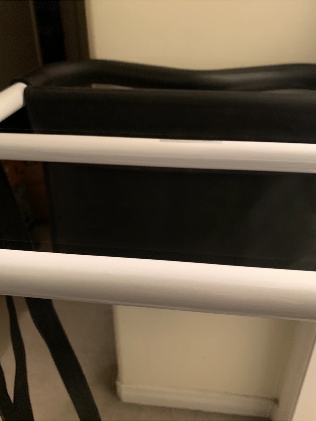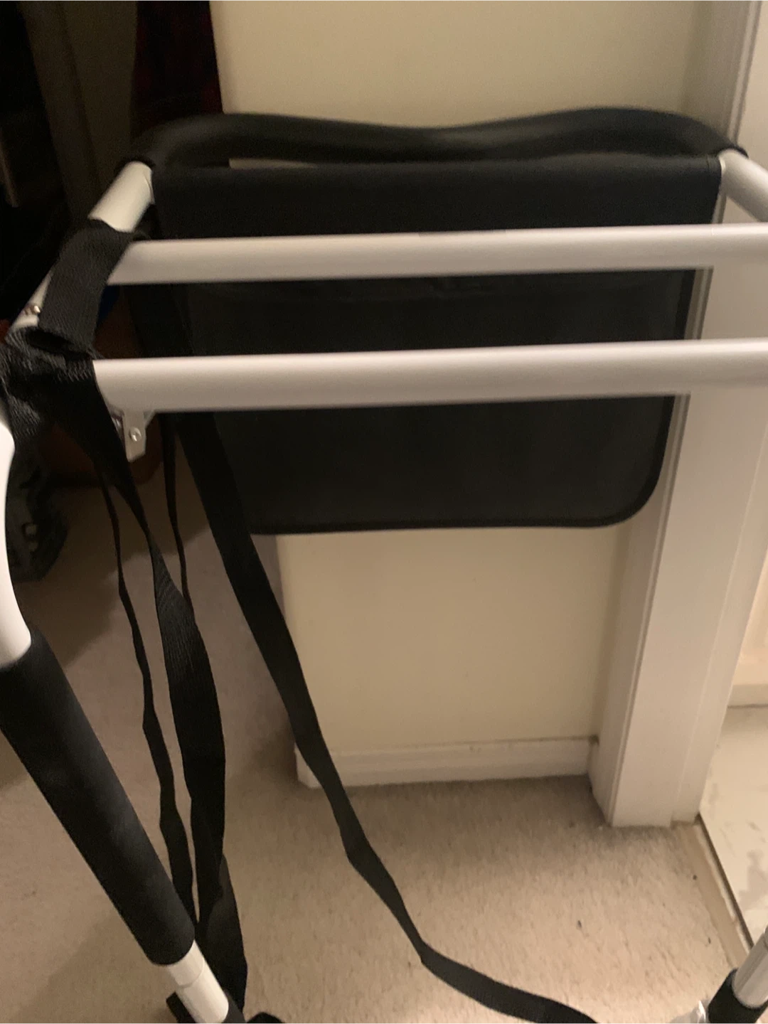 Lightweight travel stroller with black fabric and white frame. It folds compactly for easy transport. Includes safety straps and storage bag. Handy for quick trips or vacations!