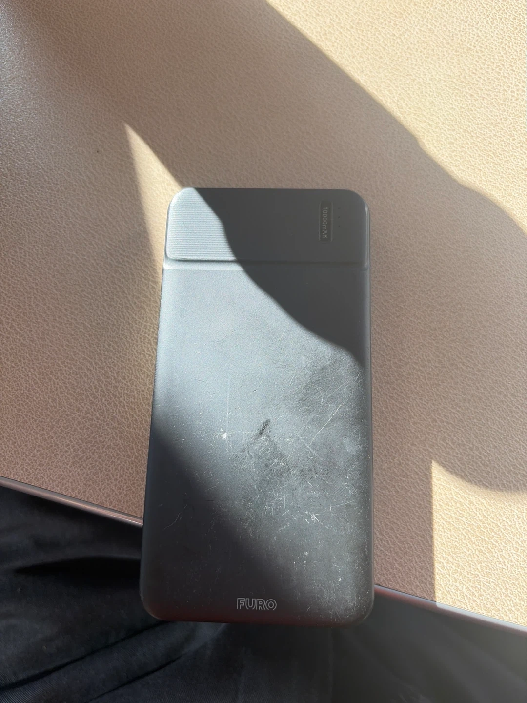 This is a FURO brand power bank with 10000mAh capacity. It's black and shows some signs of wear with scratches. The capacity is clearly marked.