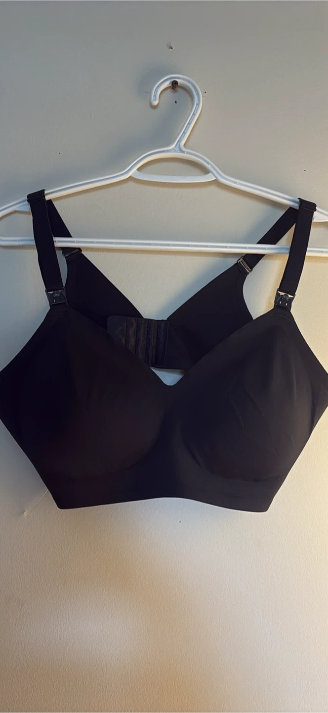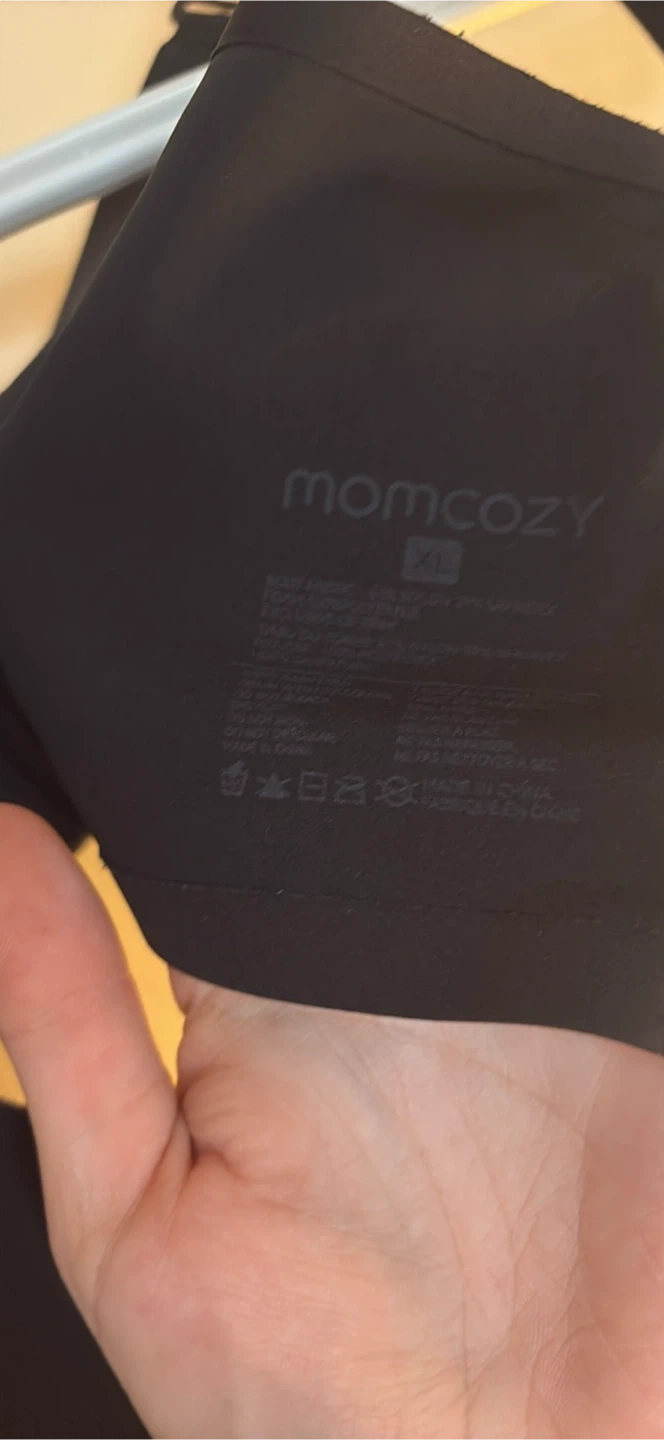 This is a black nursing bra from Momcozy. It's a size XL and made of a soft, stretchy material. The bra features adjustable straps and nursing clips for easy access. It's designed for comfort during pregnancy and breastfeeding.