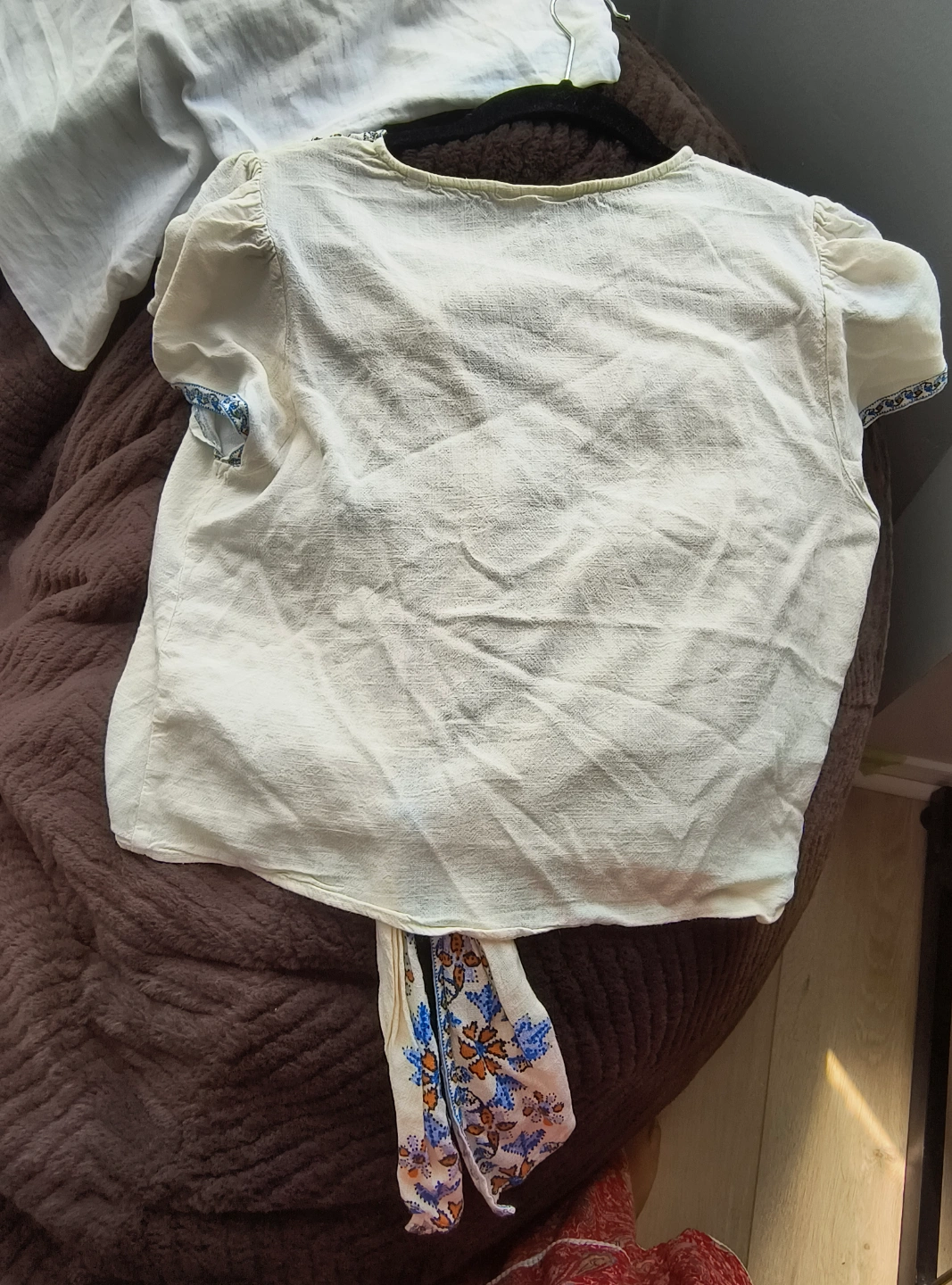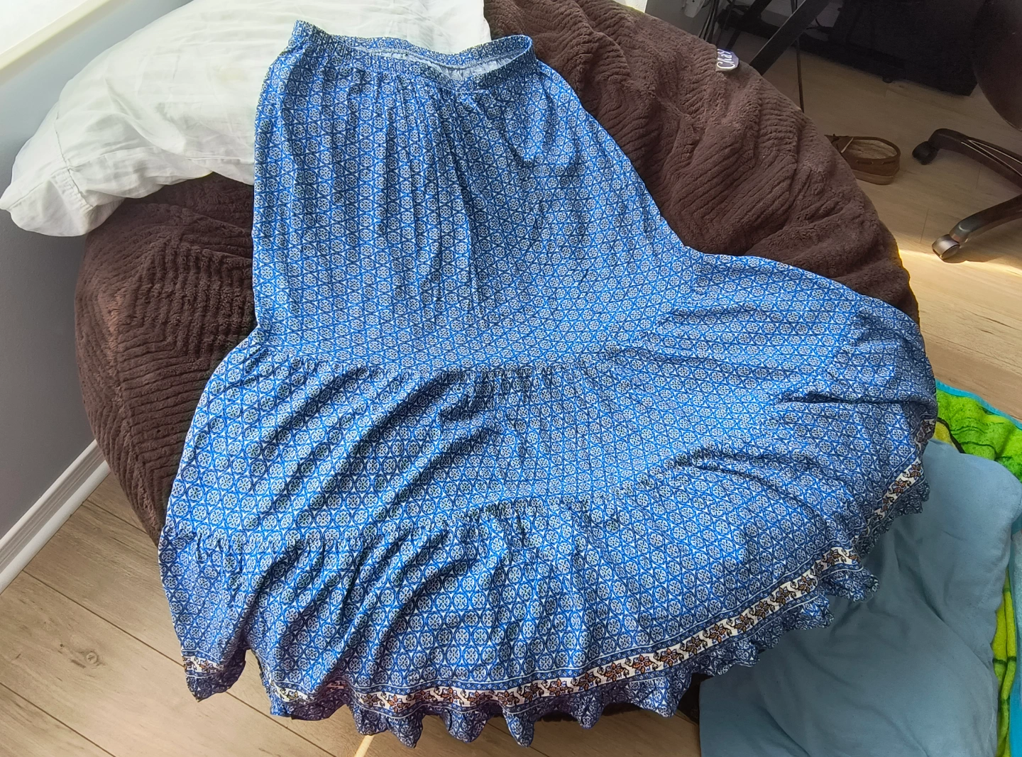 Beautiful two-piece outfit. Features a cream-coloured floral printed crop top with a tie front and a long, flowing blue and white patterned maxi skirt. Perfect for summer.