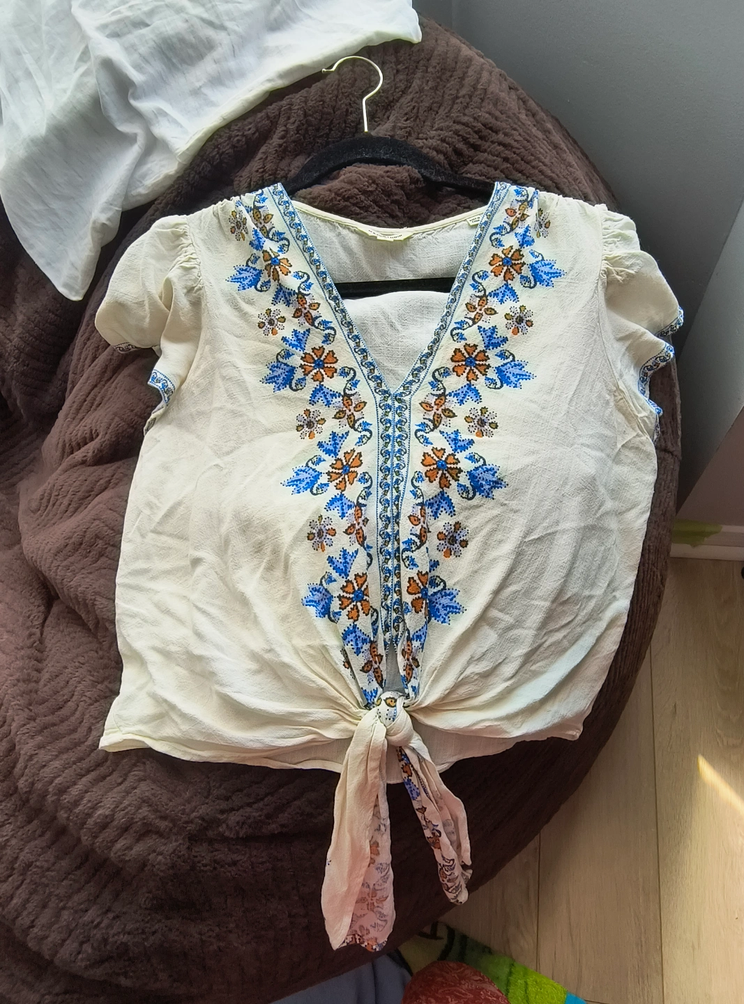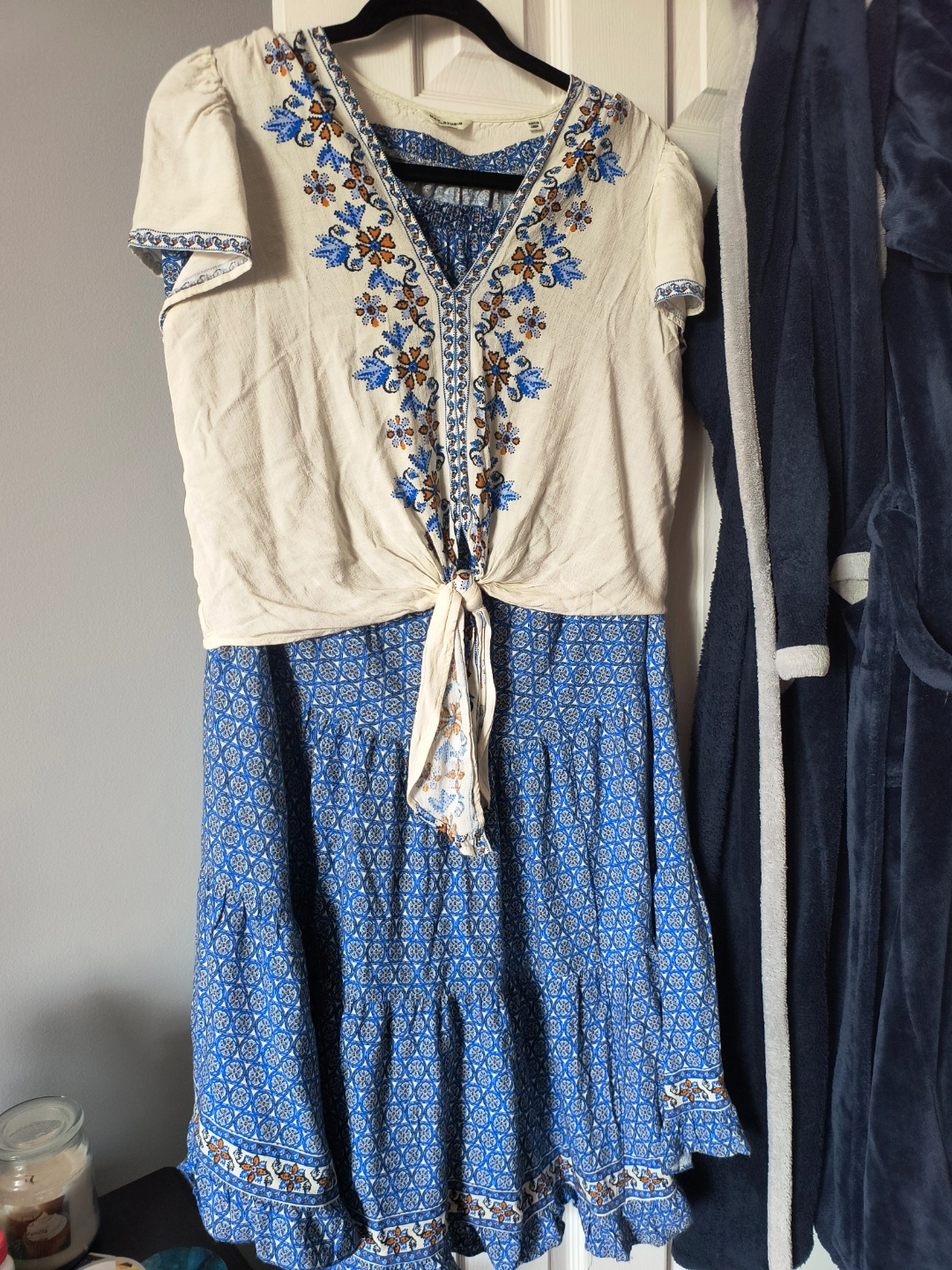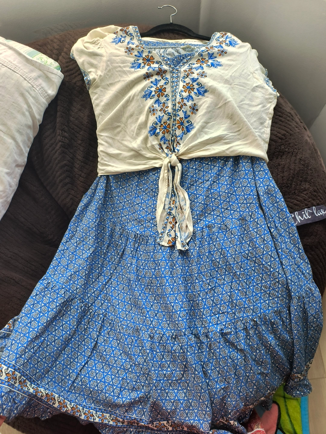 Beautiful two-piece outfit. Features a cream-coloured floral printed crop top with a tie front and a long, flowing blue and white patterned maxi skirt. Perfect for summer.