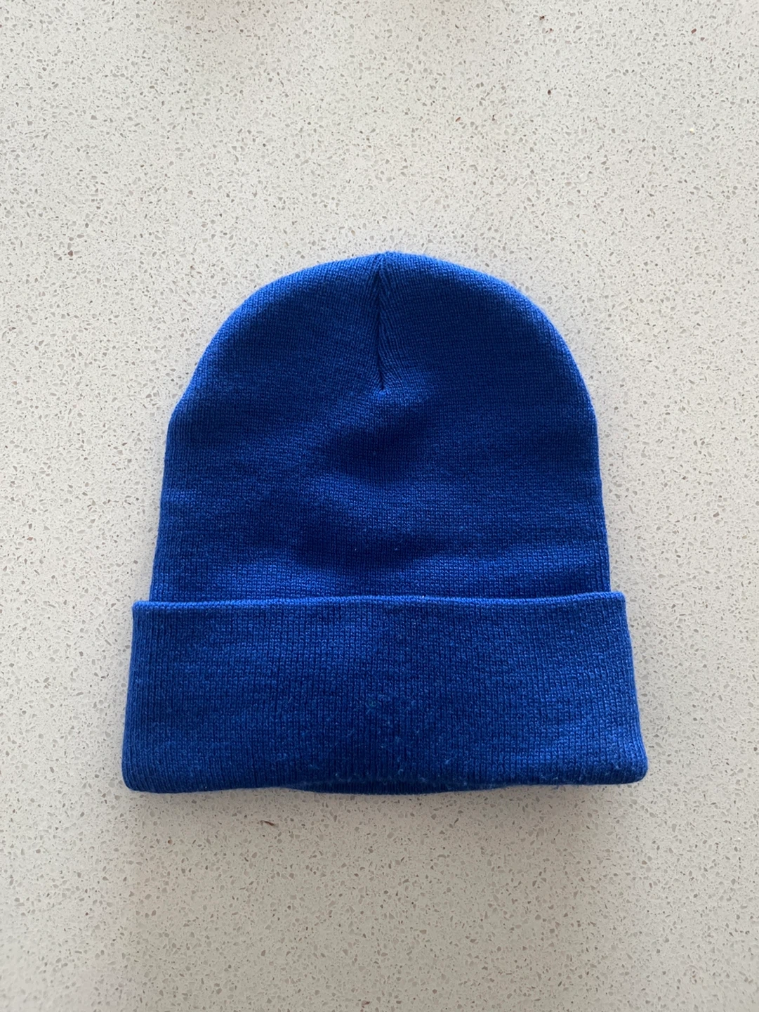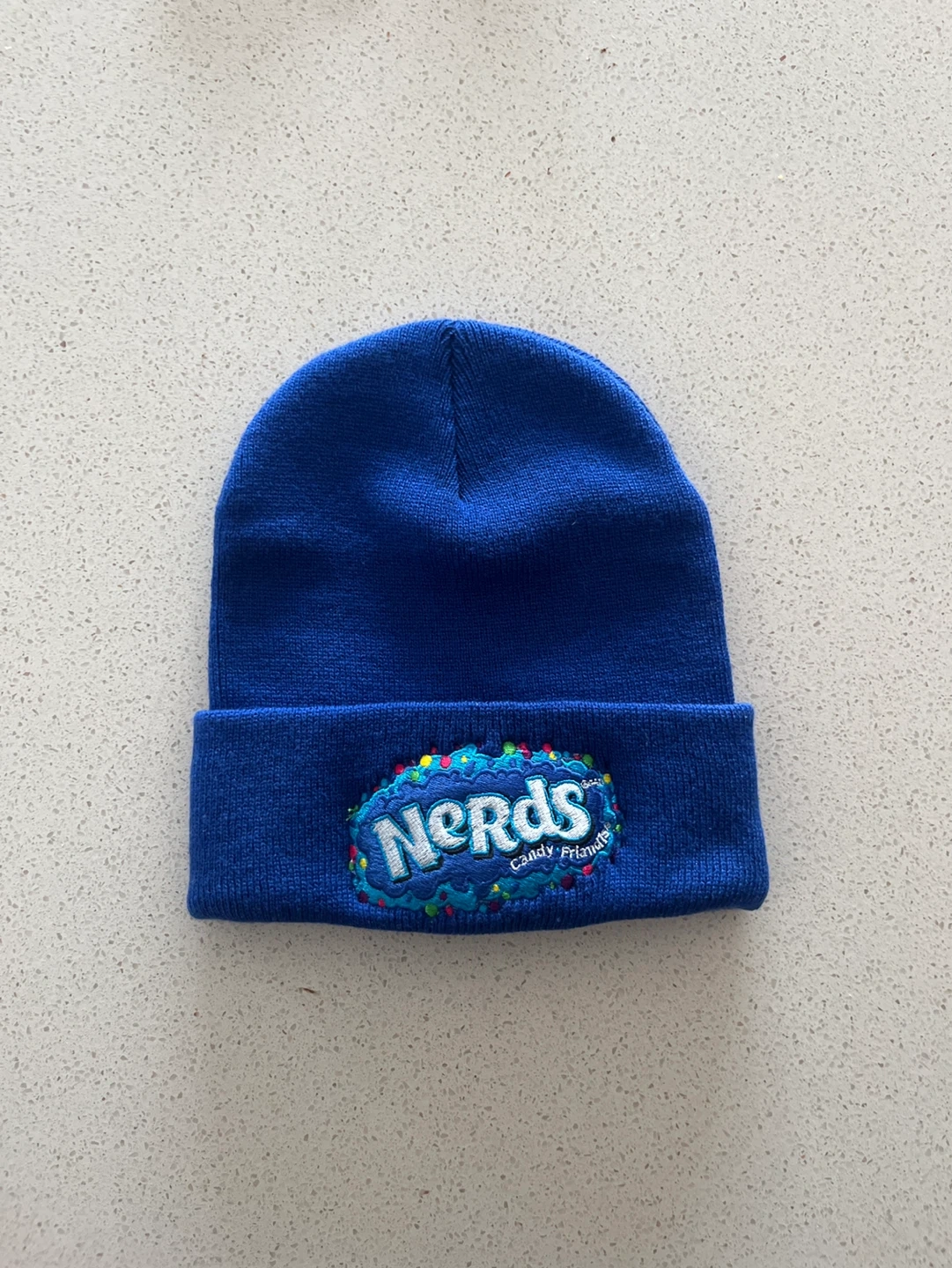 A cozy blue beanie featuring the Nerds Candy Friends logo embroidered on the front. This hat is made from a soft knit material. Perfect for cooler weather or to style!